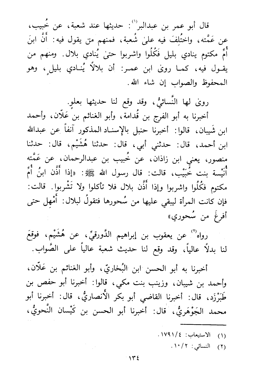أخبرنا بِهِ أَبُو الْفَرَجِ بْنُ قُدَامَةَ، وأَبُو الغنائم بْن علان، وأحمد بْن شَيْبَانَ، قَالُوا: أَخْبَرَنَا حَنْبَلٌ بِالإِسْنَادِ الْمَذْكُورِ آنِفًا عَنْ عَبد اللَّهِ بْن أَحْمَدَ، قال: حَدَّثني أبي، قال: حَدَّثَنَا هشيم، قال: حَدَّثَنَا مَنْصُورٌ، يَعْنِي ابْنَ زَاذَانَ، عَنْ خبيب بْن عَبْدِ الرَّحْمَنِ، عَنْ عَمَّتِهِ أُنَيْسَةَ بِنْتِ خُبَيْبٍ، قَالَتْ: قال رَسُولُ اللَّهِ صلى الله عليه وسلم: إِذَا أَذَّنَ ابْنُ أُمِّ مَكْتُومٍ فَكُلُوا واشْرَبُوا وإِذَا أَذَّنَ بِلالٌ فَلا تَأْكُلُوا ولا تَشْرَبُوا. قَالَتْ: فَإِنْ كَانَتِ الْمَرْأَةُ لَيَبْقَى عَلَيْهَا مِن سُحُورِهَا فَتَقُولُ لِبِلالٍ: أَمْهِلْ حَتَّى أَفْرَغَ مِنْ سُحُورِي.