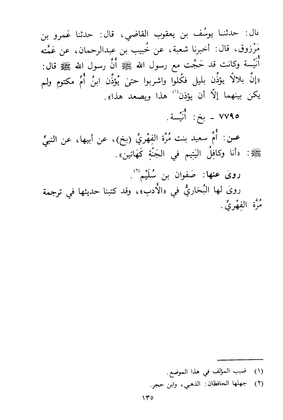 عَن: أم سَعِيد بنت مرة الفهري (بخ) ، عَن أبيها، عَنِ النَّبِيِّ صلى الله عليه وسلم: أنا وكافل اليتيم في الجنة كهاتين.