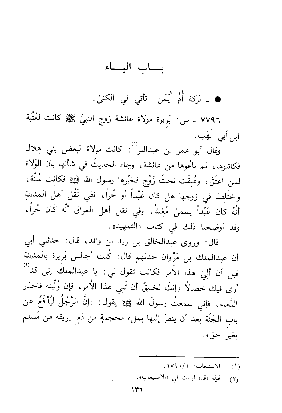 قال: ورَوَى عبد الخالق بْن زَيْد بْن واقِدٍ، قال: حَدَّثني أَبِي أَنَّ عَبد المَلِك بْنَ مَرْوَانَ حَدَّثَهُمْ قال: كُنْتُ أُجَالِسُ بَرِيرَةَ بِالْمَدِينَةِ قَبْلَ أَنْ أَلِيَ هَذَا الأَمْرَ فَكَانَتْ تَقُولُ لِي: يَا عَبد المَلِك إِنِّي قَدْ (2) أَرَى فِيكَ خِصَالا وإِنَّكَ لَخَلِيقٌ أَنْ تَلِيَ هَذَا الأَمْرَ، فَإِنْ ولِيتَهُ فَاحْذَرِ الدِّمَاءَ، فَإِنِّي سَمِعْتُ رَسُولَ اللَّهِ صَلَّى اللَّهُ عَلَيْهِ وسَلَّمَ يقول: إِنَّ الرَّجُلَ لَيُدْفَعُ عَنْ بَابِ الْجَنَّةِ بَعْدَ أَنْ يَنْظُرَ إِلَيْهَا بِمِلْءِ مِحْجَمَةٍ مِنْ دَمٍ يُرِيقُهُ من مسلم بغير حق.