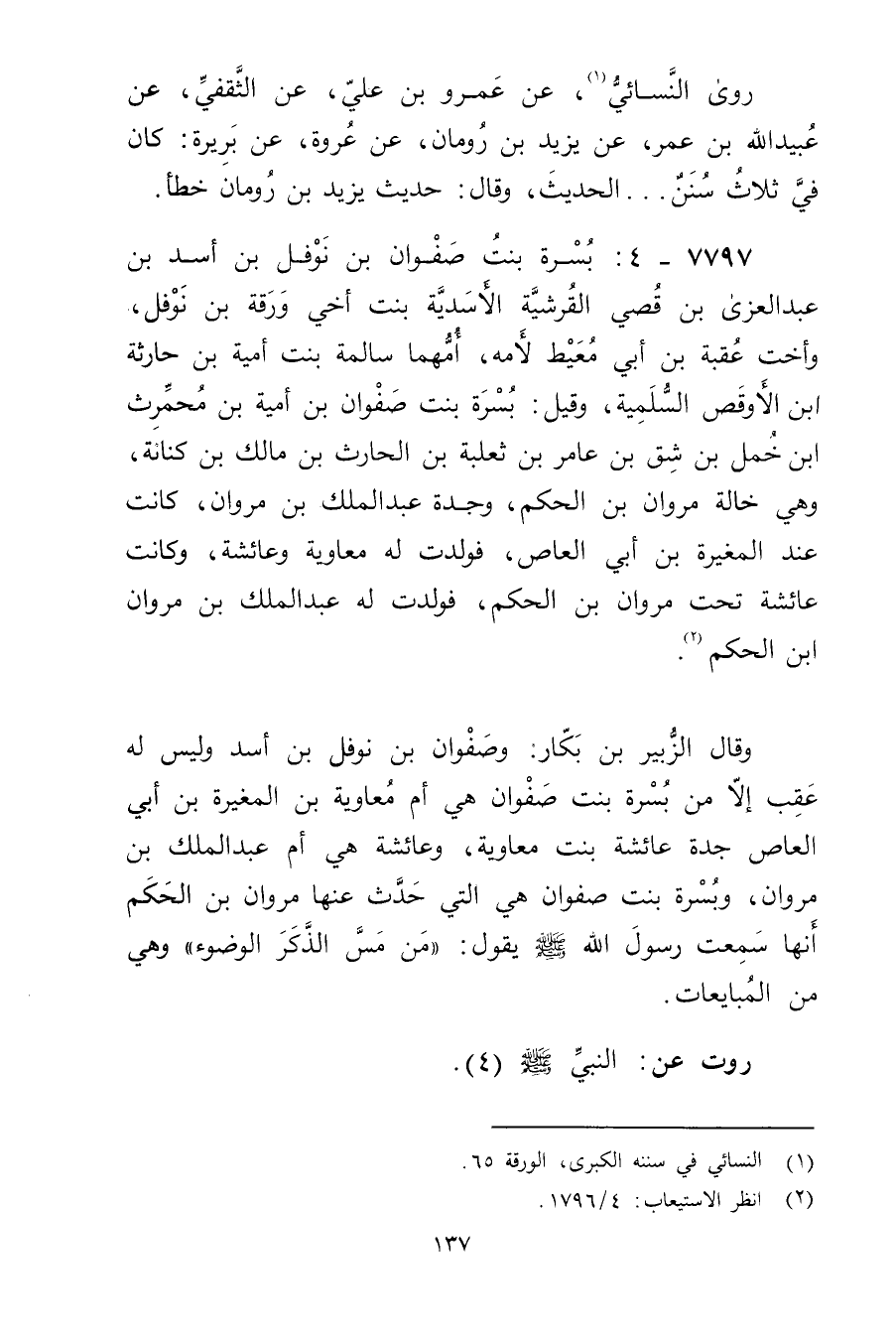 7797 - 4: بسرة بنت صفوان بن نوفل بن أسد بن عبد العزى بن قصي القرشية الأسدية بنت أخي ورقة بن نوفل، وأخت عقبة بن أَبي معيط لأمه، أمهما سالمة بنت أمية بن حارثة ابن الأوقص السلمية، وقيل: بسرة بنت صفوان بن أمية بن محمرث ابن خمل بن شق بن عامر بن ثعلبة بن الحارث بن مالك بن كنانة، وهي خالة مروان بن الحكم، وجدة عَبد المَلِك بن مروان، كانت عند المغيرة بن أَبي العاص، فولدت له معاوية وعائشة، وكانت عائشة تحت مروان بن الحكم، فولدت له عَبد المَلِك بن مروان ابن الحكم (2) .