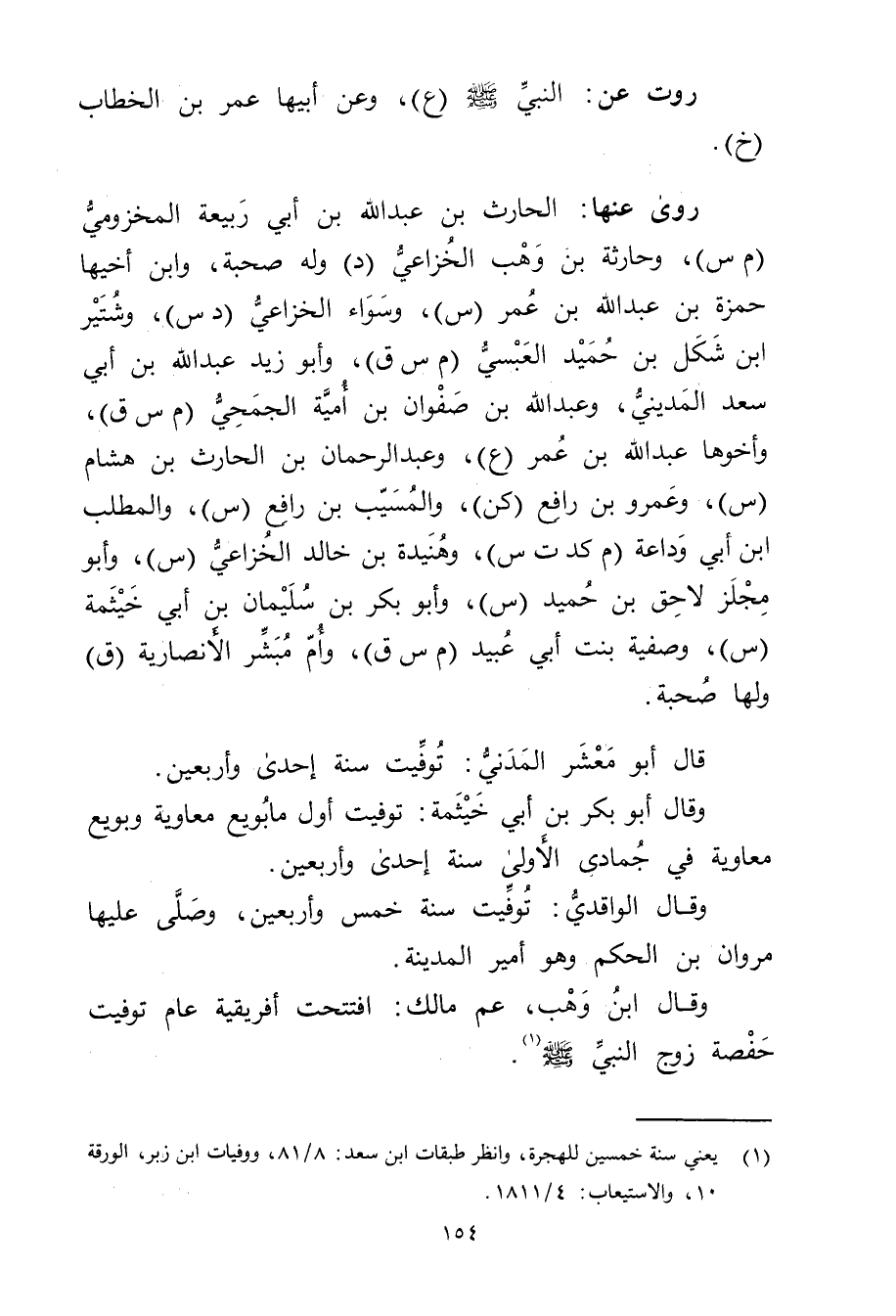 (1) يعني سنة خمسين للهجرة، وانظر طبقات ابن سعد: 8 / 81، ووفيات ابن زبر، الورقة 10، والاستيعاب: 4 / 1811.