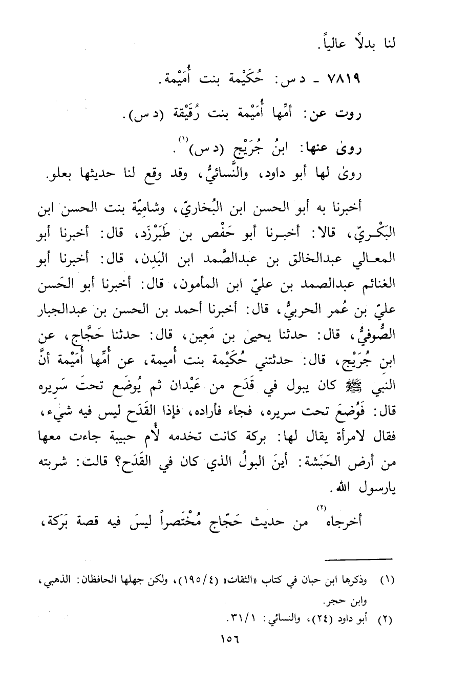 أخبرنا بِهِ أَبُو الْحَسَن بْن الْبُخَارِيّ، وشامية بِنْت الْحَسَنِ بْنِ الْبَكْرِيِّ، قَالا: أَخْبَرَنَا أبو حفص بن طَبَرْزَذَ، قال: أَخْبَرَنَا أَبُو الْمَعَالِي عَبْدُ الخالق بن عبد الصمد ابن الْبَدَنِ، قال: أخبرنا أَبُو الْغَنَائِمِ عبد الصمد بن علي ابن الْمَأْمُونِ، قال: أَخْبَرَنَا أَبُو الْحَسَنِ علي بْن عُمَر الْحَرْبِيّ، قال: أَخْبَرَنَا أَحْمَد بْن الْحَسَن بْن عَبْدِ الْجَبَّارِ الصُّوفِيُّ، قال: حَدَّثَنَا يحيى بْن مَعِين، قال: حَدَّثَنَا حَجَّاجٌ، عَنِ ابْنِ جُرَيْج، قال: حَدَّثَتْنِي حَكِيمَةُ بِنْتُ أُمَيْمَةَ، عَنْ أُمِّهَا أُمَيْمَةَ أَنَّ النَّبِيَّ صلى الله عليه وسلم كَانَ يَبُولُ فِي قَدَحٍ مِنْ عَيْدَانٍ ثُمَّ يُوضَعُ تَحْتَ سَرِيرِهِ قال: فَوُضِعَ تَحْتَ سَرِيرِهِ، فَجَاءَ فَأَرَادَهُ، فَإِذَا الْقَدَحُ لَيْسَ فِيهِ شَيْءٌ، فَقَالَ لامْرَأَةٍ يُقَالُ لَهَا: بَرَكَةُ كَانَتْ تَخْدُمُهُ لأُم حَبِيبَةَ جَاءَتْ مَعَهَا مِنْ أَرْضِ الْحَبَشَةِ: أَيْنَ الْبَوْلُ الَّذِي كَانَ فِي الْقَدَحِ؟ قَالَتْ: شَرِبْتُهُ يَا رَسُولَ اللَّهِ.