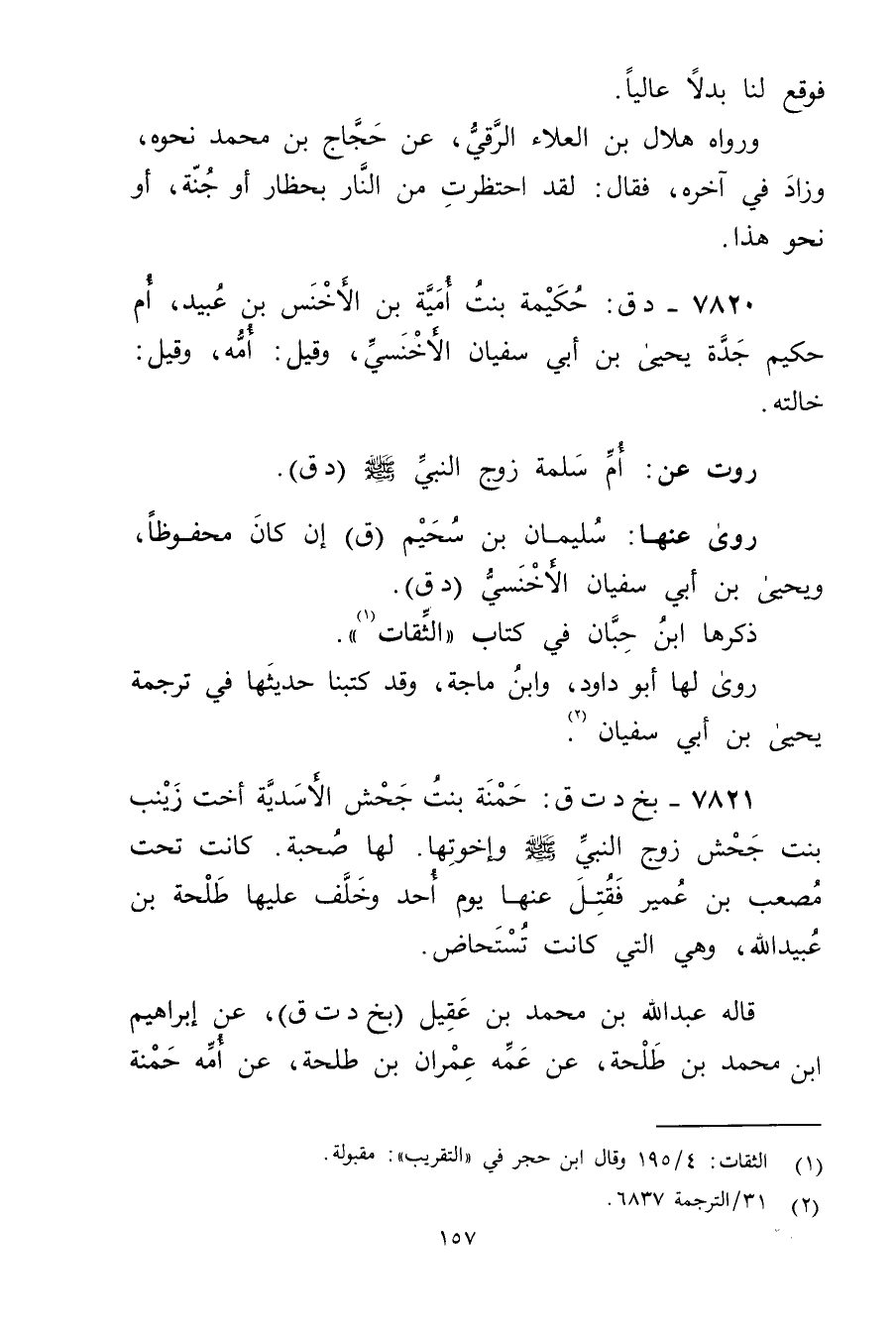 7821 - بخ دت ق: حمنة بنت جحش الأسدية أخت زينب بنت جحش زوج النَّبِيُّ صلى الله عليه وسلم وأخوتها. لها صحبة. كانت تحت مصعب بن عُمَير فقتل عنها يوم أحد وخلف عليها طلحة بن عُبَيد الله، وهي التي كانت تستحاض.