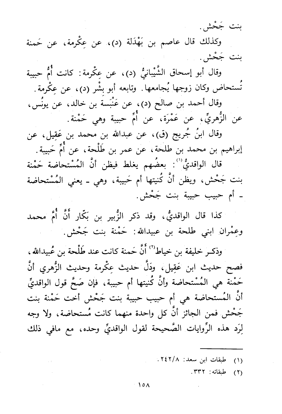 وذكر خليفة بن خياط (2) أن حمنة كانت عند طلحة بن عُبَيد الله، فصح حديث ابن عقيل، ودل حديث عكرمة وحديث الزُّهْرِيّ أن حمنة هي المستحاضة وأن كنيتها أم حبيبة، فإن صح قول الواقدي أن المستحاضة هي أم حبيب حبيبة بنت جحش أخت حمنة بنت جحش فمن الجائز أن كل واحدة منهما كانت مستحاضة، ولاوجه لرد هذه الروايات الصحيحة لقول الواقدي وحده، مع ما في ذلك