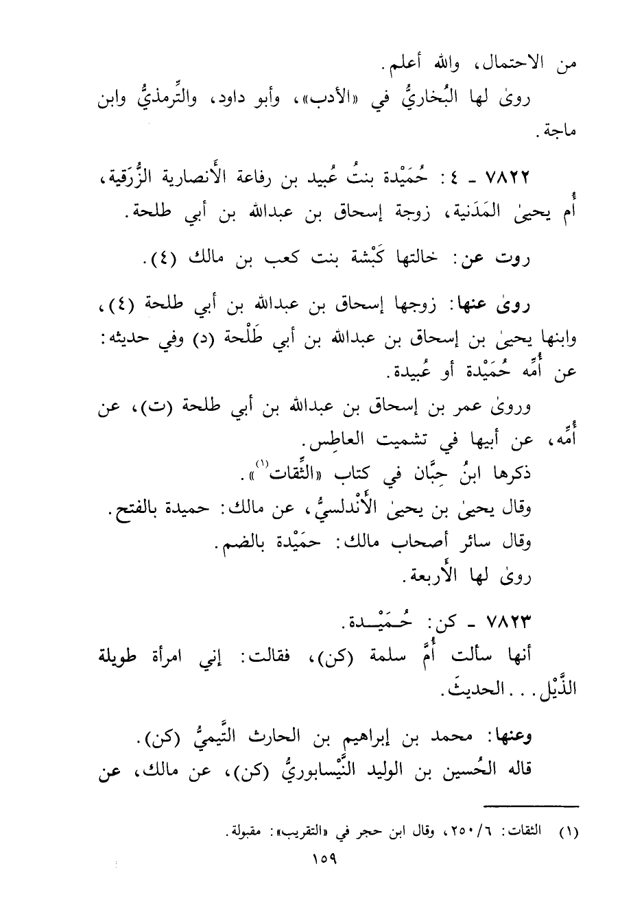 7822 - 4: حميدة بنت عُبَيد بن رفاعة الأَنْصارِيّة الزرقية، أم يحيى المدنية، زوجة إسحاق بْن عَبد الله بْن أَبي طلحة.
