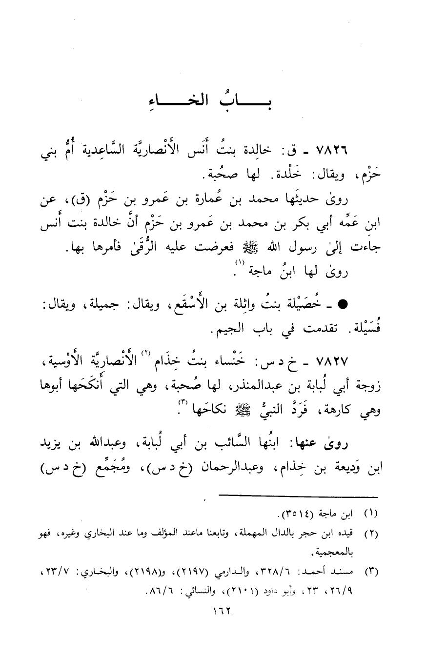 7826 - ق: خالدة بنت أنس الأَنْصارِيّة الساعدية أم بني حزم، ويُقال: خلدة. لها صحبة.