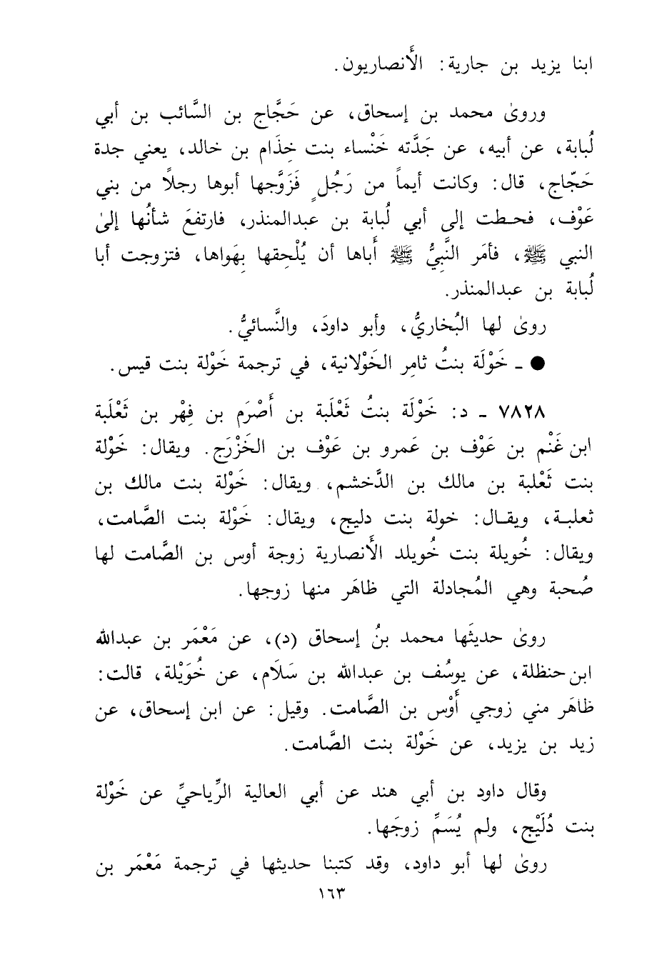 7828 - د: خولة بنت ثعلبة بن أصرم بن فهر بن ثعلبة ابن غنم بن عوف بن عَمْرو بن عوف بن الخزرج. ويُقال: خولة بنت ثعلبة بن مالك بن الدخشم، ويُقال: خولة بنت مالك بن