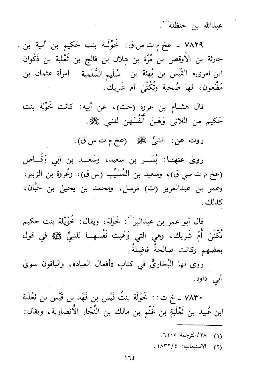7829 - عخ م ت س ق: خولة بنت حكيم بن أمية بن حارثة بن الأوقص بن مرة بن هلال بن فالج بن ثعلبة بن ذكوان ابن امرئ القيس بن بهثة بن سليم السلمية امرأة عثمان بن مظعون، لها صحبة وتكنى أم شَرِيك.