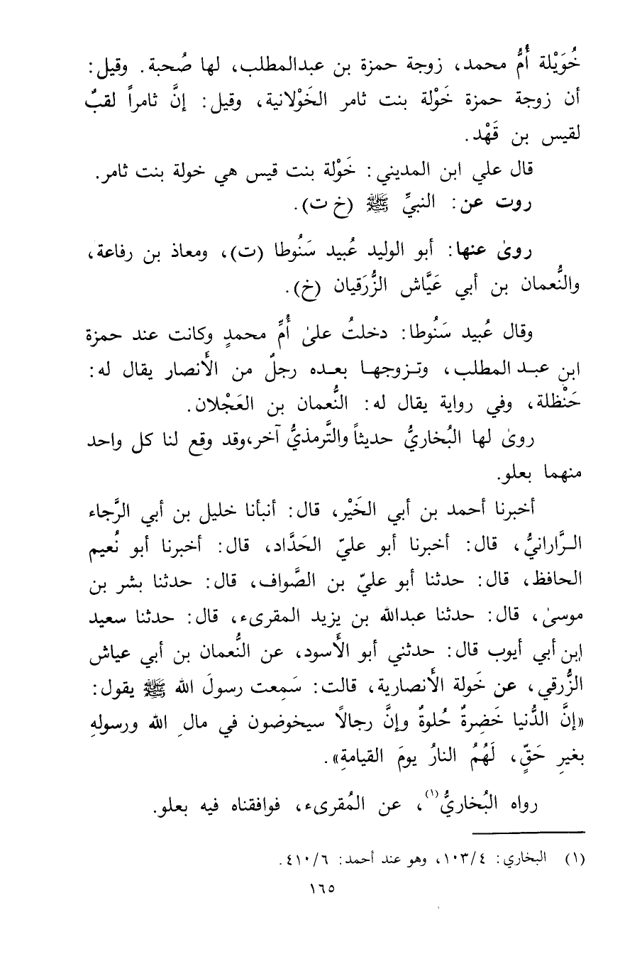أَخْبَرَنَا أَحْمَدُ بْن أَبي الخير، قال: أَنْبَأَنَا خليل بْن أَبي الرجاء الراراني، قال: أَخْبَرَنَا أَبُو عَلِيّ الحداد، قال: أَخْبَرَنَا أَبُو نُعَيْمٍ الْحَافِظُ، قال: حَدَّثَنَا أَبُو عَلِيِّ بْنُ الصواف، قال: حَدَّثَنَا بشر بن مُوسَى، قال: حَدَّثَنَا عَبد اللَّهِ بْن يَزِيدَ المقرئ، قال: حَدَّثَنَا سَعِيد ابن أَبي أَيُّوبَ قال: حَدَّثَنِي أَبُو الأَسْوَدِ، عَنِ النُّعْمَانِ بْنِ أَبي عَيَّاشٍ الزُّرْقِيِّ، عَنْ خَوْلَةَ الأَنْصارِيّة، قَالَتْ: سَمِعْتُ رَسُولَ اللَّهِ صَلَّى اللَّهُ عَلَيْهِ وسَلَّمَ يَقُولُ: إِنَّ الدُّنْيَا خَضِرَةٌ حُلْوَةٌ وإِنَّ رِجَالا سَيَخُوضُونَ فِي مَالِ اللَّهِ ورَسُولِهِ بِغَيْرِ حَقٍّ، لَهُمُ النَّارُ يَوْمَ الْقِيَامَةِ.