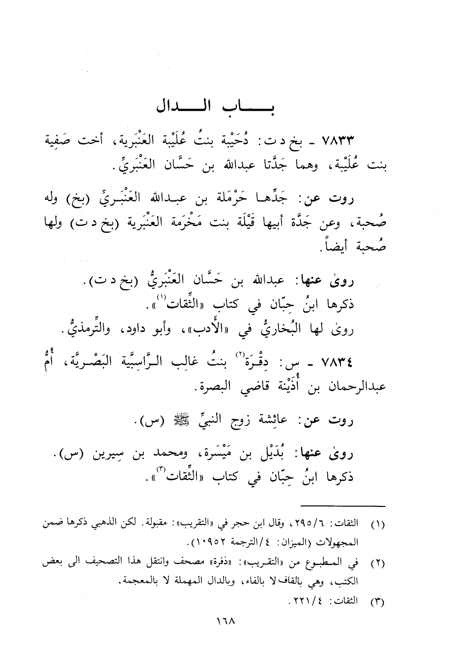 7833 - بخ د ت: دحيبة بنت عليبة العنبرية، أخت صفية بنت عليبة، وهما جدتا عَبد اللَّهِ بْن حسان العنبري.