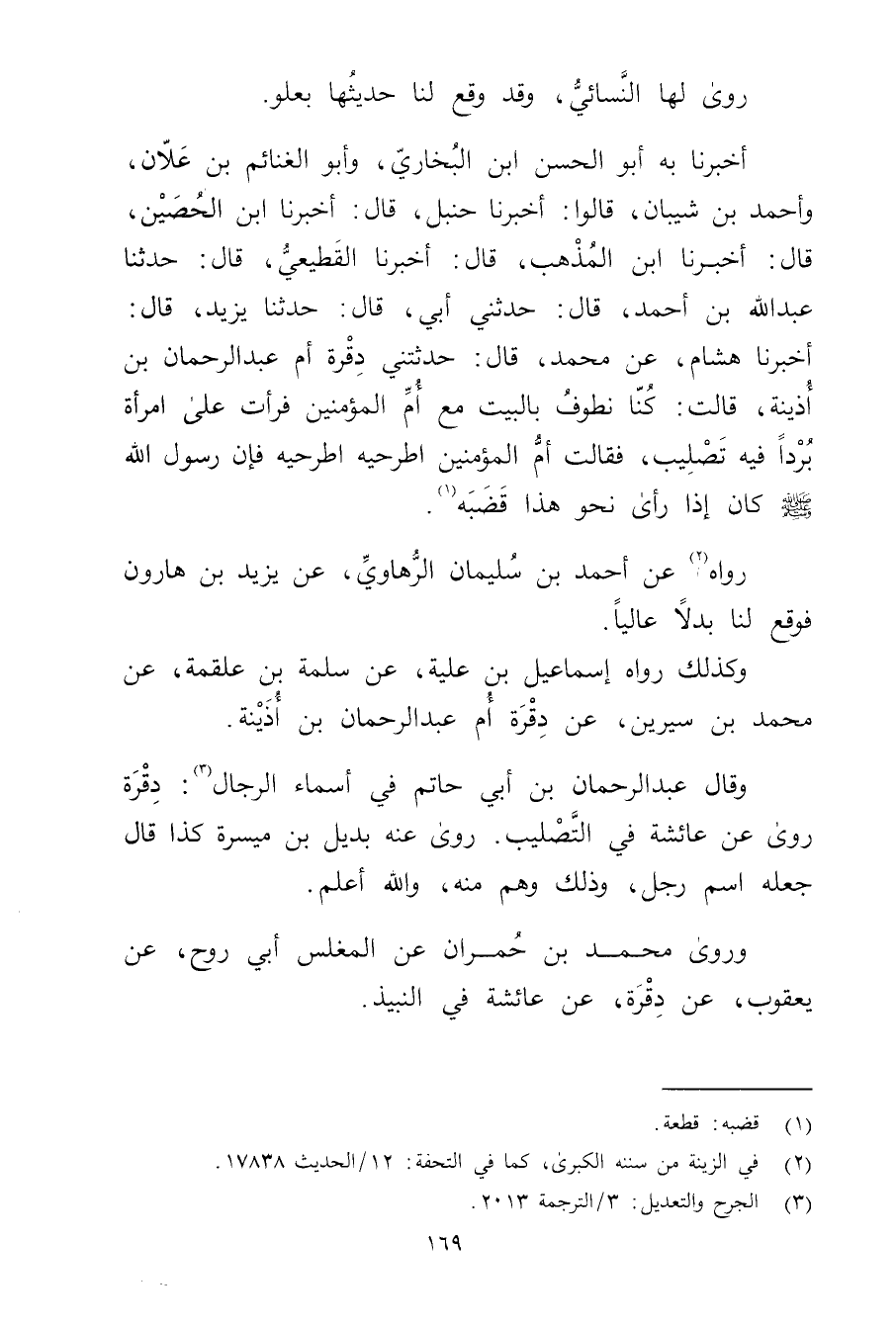 أخبرنا بِهِ أَبُو الحسن بْن البخاري، وأبو الغنائم بْن علان، وأحمد بْن شيبان، قَالُوا: أخبرنا حنبل، قال: أخبرنا ابن الحصين، قال: أخبرنا ابْنُ الْمُذْهِب، قال: أخبرنا القَطِيعِيّ، قال: حَدَّثَنَا عَبد اللَّهِ بْن أَحْمَدَ، قال: حَدَّثني أبي، قال حَدَّثَنَا يَزِيدُ، قال: أَخْبَرَنَا هِشَامُ، عَنْ مُحَمَّدٍ، قال: حَدَّثَتْنِي دِقْرَةُ أم عبد الرحمن بن أذينة، قَالَتْ: كُنَّا نَطُوفُ بِالْبَيْتِ مَعَ أُمِّ الْمُؤْمِنِينَ فَرَأَتْ عَلَى امْرَأَةٍ بُرْدًا فِيهِ تَصْلِيبٌ، فَقَالَتْ أُمُّ الْمُؤْمِنِينَ اطْرَحِيهِ اطْرَحِيهِ فَإِنَّ رَسُولَ اللَّهِ صلى الله عليه وسلم كَانَ إِذَا رَأَى نَحْوَ هَذَا قَضَبَهُ (1) .