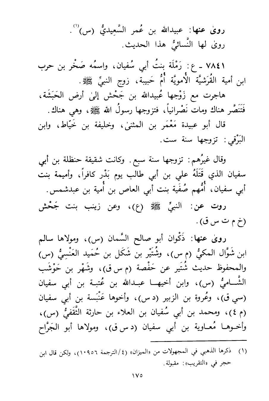 7841 - ع: رملة بنت أبي سفيان، واسمه صخر بن حرب ابن أمية القرشية الأُمَوِية أم حبيبة، زوج النَّبِيّ صَلَّى اللَّهُ عَلَيْهِ وسلم.