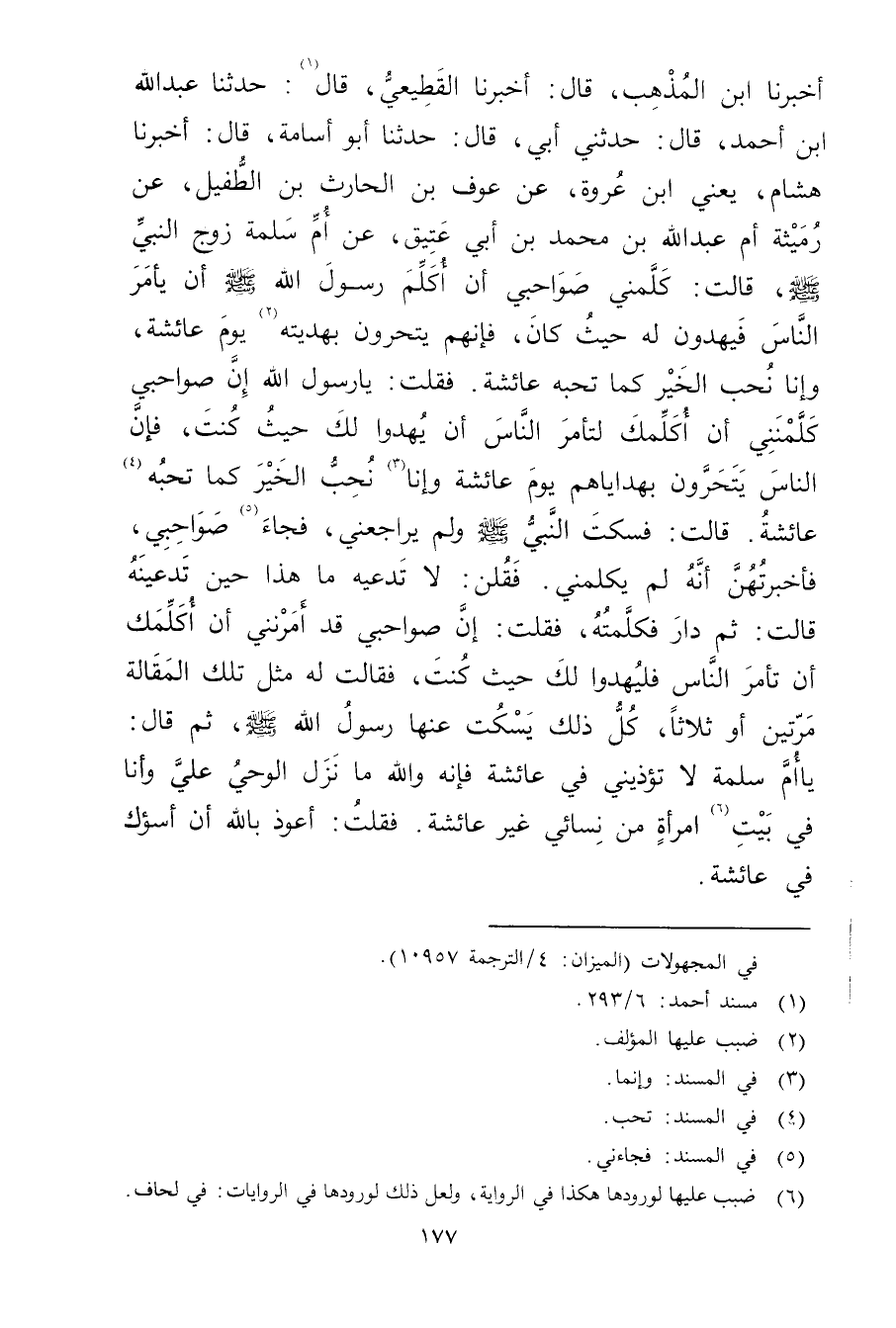 أخبرنا ابْنُ الْمُذْهِب، قال: أخبرنا القَطِيعِيّ، قال (1) : حَدَّثَنَا عَبد الله بْن أَحْمَدَ، قال: حَدَّثني أبي، قال: حَدَّثَنَا أَبُو أُسَامَةَ، قال: أخبرنا هِشَامٌ، يَعْنِي ابْنَ عُرْوَةَ، عَنْ عَوْفِ بْنِ الْحَارِثِ بْنِ الطُّفَيْلِ، عَنْ رُمَيْثَةَ أُمِّ عَبد الله بْن مُحَمَّد بْن أَبي عَتِيقٍ، عَنْ أُمِّ سَلَمَةَ زَوْجِ النَّبِيُّ صلى الله عليه وسلم، قَالَتْ: كَلَّمَنِي صَوَاحِبِي أَنْ أُكَلِّمَ رَسُول اللَّهِ صلى الله عليه وسلم أَنْ يَأْمُرَ النَّاسَ فَيُهْدُونَ لَهُ حَيْثُ كَانَ، فَإِنَّهُمْ يَتَحَرَّوْنَ بِهَدِيَّتِهِ (2) يَوْمَ عَائِشَةَ، وإِنَّا نُحِبُّ الْخَيْرَ كَمَا تُحِبُّهُ عَائِشَةُ. فَقُلْتُ: يَا رَسُولَ اللَّهِ إِنَّ صَوَاحِبِي كَلَّمْنَنِي أَنْ أُكَلِّمَكَ لِتَأْمُرَ النَّاسَ أَنْ يُهْدُوا لَكَ حَيْثُ كُنْتَ، فَإِنَّ النَّاسَ يَتَحَرَّوْنَ بِهَدَايَاهُمْ يَوْمَ عَائِشَةَ وإِنَّا (3) نُحِبُّ الْخَيْرَ كَمَا تُحِبُّهُ (4) عَائِشَةُ. قَالَتْ: فَسَكَتَ النَّبِيُّ صَلَّى اللَّهُ عليه وسلم ولم يُرَاجِعْنِي، فَجَاءَ (5) صَوَاحِبِي، فَأَخْبَرْتُهُنَّ أَنَّهُ لَمْ يُكَلِّمْنِي. فَقُلْنَ: لا تَدَعِيهِ مَا هَذَا حِينَ تَدَعِينَهُ قَالَتْ: ثُمَّ دَارَ فَكَلَّمْتُهُ، فَقُلْتُ: إِنَّ صَوَاحِبِي قَدْ أَمَرْنَنِي أَنْ أُكَلِّمَكَ أَنْ تَأْمُرَ النَّاسَ فَلْيُهْدُوا لَكَ حَيْثُ كُنْتَ، فَقَالَتْ لَهُ مِثْلَ تِلْكَ الْمَقَالَةِ مَرَّتَيْنِ أَوْ ثَلاثًا، كُلُّ ذَلِكَ يَسْكُتُ عَنْهَا رَسُولُ اللَّهِ صلى الله عليه وسلم، ثُمَّ قال: يَا أُمَّ سَلَمَةَ لا تُؤْذِينِي فِي عَائِشَةَ فَإِنَّهُ واللَّهِ مَا نَزَلَ الْوَحْيُ عَلَيَّ وأَنَا فِي بَيْتِ (6) امْرَأَةٍ مِنْ نِسَائِي غَيْرَ عَائِشَةَ. فَقُلْتُ: أَعُوذُ بالله أن أسؤك في عائشة.