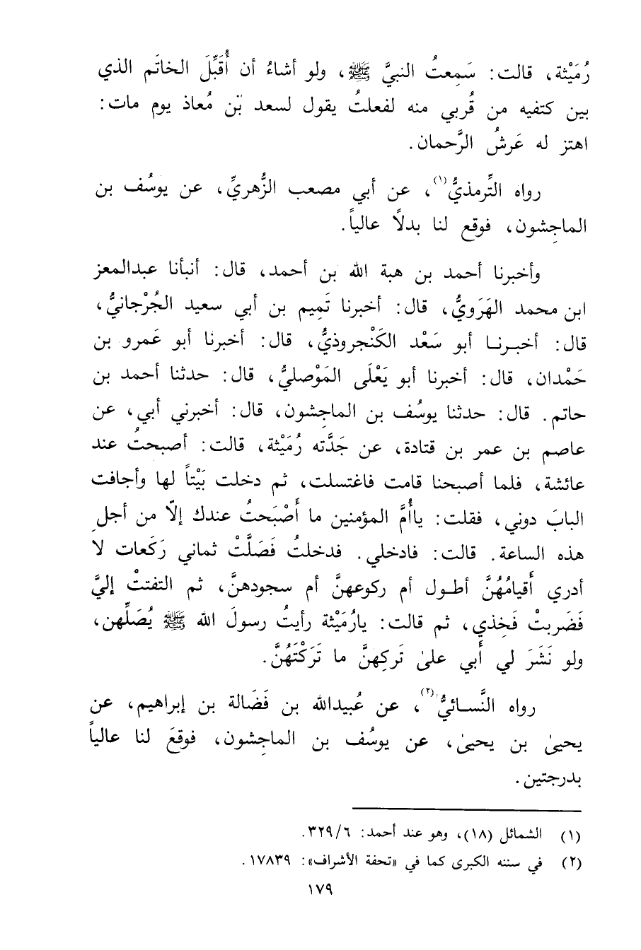 وأَخْبَرَنَا أَحْمَد بْن هبة اللَّه بْن أَحْمَدَ، قال: أَنْبَأَنَا عَبْدُ الْمُعِزِّ ابْنُ مُحَمَّدٍ الْهَرَوِيُّ، قال: أَخْبَرَنَا تَمِيمُ بْنُ أَبي سَعِيد الْجُرْجَانِيُّ، قال: أخبرنا أَبُو سَعْدٍ الْكَنْجَرُوذِيُّ، قال: أخبرنا أَبُو عَمْرو بْنُ حمدان، قال: أخبرنا أَبُو يَعْلَى الْمَوْصِلِيُّ، قال: حَدَّثَنَا أَحْمَدُ بْنُ حَاتِمٍ. قال: حَدَّثَنَا يُوسُفُ بْنُ الْمَاجِشُونِ، قال: أَخْبَرَنِي أَبِي، عَنْ عاصم بن عُمَر بن قتادة، عَنْ جَدَّتِهِ رُمَيْثَةَ، قَالَتْ: أَصْبَحْتُ عِنْدَ عَائِشَةَ، فَلَمَّا أَصْبَحْنَا قَامَتْ فَاغْتَسَلَتْ، ثُمَّ دَخَلَتْ بَيْتًا لَهَا وأَجَافَتِ الْبَابَ دُونِي، فَقُلْتُ: يَا أُمَّ الْمُؤْمِنِينَ مَا أَصْبَحْتُ عِنْدَكِ إِلا مِنْ أَجْلِ هَذِهِ السَّاعَةِ. قَالَتْ: فَادْخُلِي. فَدَخَلَتْ فَصَلَّتْ ثَمَانِي رَكْعَاتٍ لا أَدْرِي أَقِيَامُهُنَّ أَطْوَلُ أَمْ رُكُوعُهُنَّ أَمْ سُجُودُهُنَّ، ثُمَّ الْتَفَتَتْ إِلَيَّ فَضَرَبَتْ فَخْذِي، ثُمَّ قَالَتْ: يَا رُمَيْثَةُ رَأَيْتُ رَسُولَ اللَّهِ صلى الله عليه وسلم يصلهن، ولَوْ نَشَرَ لِي أَبِي عَلَى تَرْكِهِنَّ مَا تَرَكْتُهُنَّ.