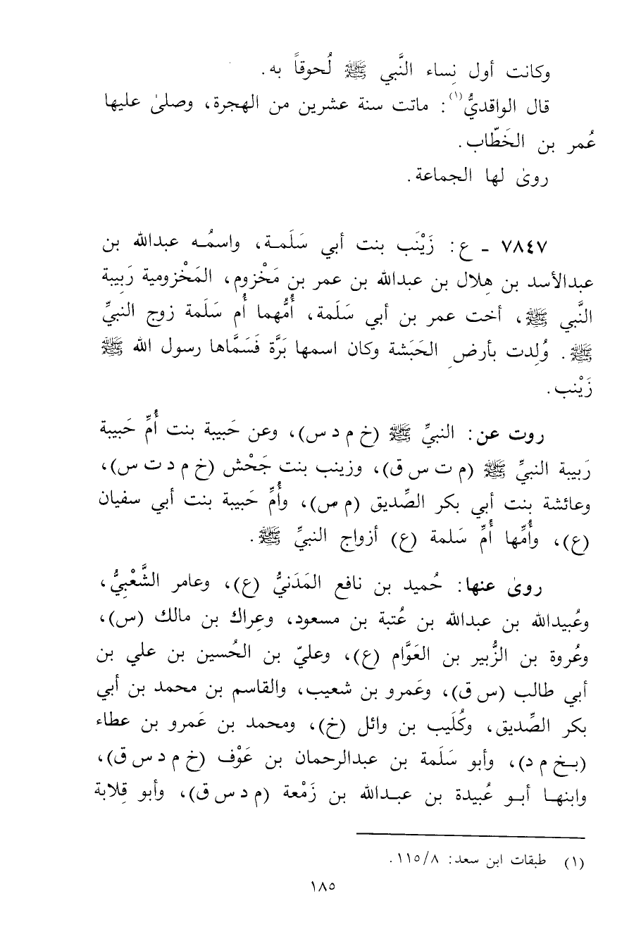 7847 - ع: زينب بنت أبي سلمة، واسمه عَبد الله بْن عَبْد الأسد بن هلال بن عَبد الله بْن عُمَر بْن مخزوم، المخزومية ربيبة النبي صلى الله عليه وسلم، أخت عُمَر بن أَبي سلمة، أمهما أم سلمة زوج النَّبِيّ صَلَّى اللَّهُ عَلَيْهِ وسلم، ولدت بأرض الحبشة وكان اسمها برة فسماها رسول الله صَلَّى اللَّهُ عَلَيْهِ وسَلَّمَ زَيْنَبَ.