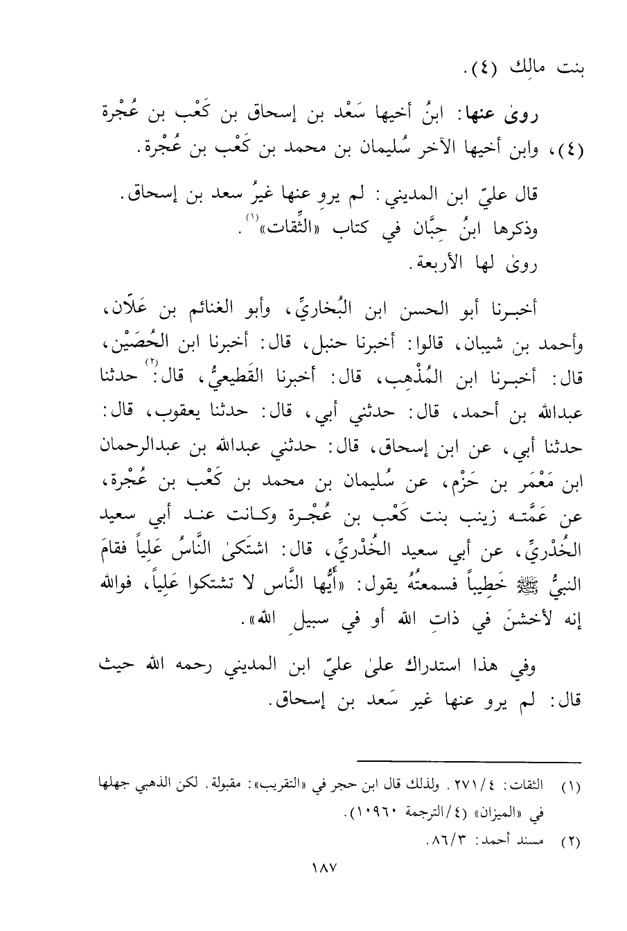 وفِي هَذَا اسْتِدْرَاكٌ عَلَى عَلِيِّ ابن الْمَدِينِيِّ رَحِمَهُ اللَّهُ حَيْثُ قال: لم يرو عنها غير سعد بن إسحاق.