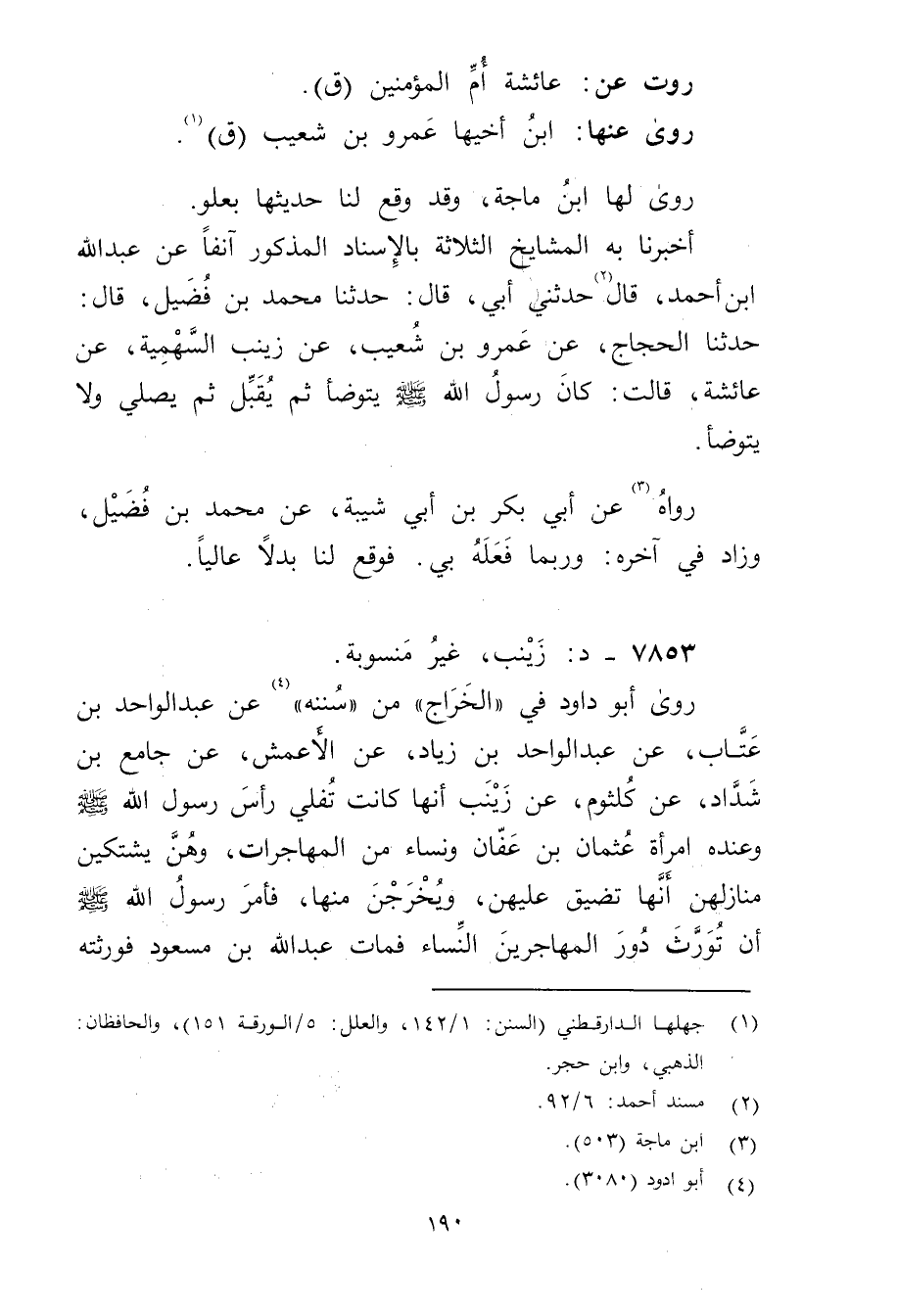 أخبرنا بِهِ المشايخ الثلاثة بالإسناد المذكور آنفا عَنْ عَبد اللَّهِ بْن أَحْمَدَ، قال (2) حَدَّثني أبي، قال: حَدَّثَنَا مُحَمَّد بْن فضيل، قال: حَدَّثَنَا الْحَجَّاجُ، عَنْ عَمْرو بْنِ شُعَيْبٍ، عَنْ زَيْنَبَ السَّهْمِيَّةِ، عَنْ عَائِشَةَ، قَالَتْ: كَانَ رَسُولُ اللَّهِ صَلَّى الله عليه وسلم يَتَوَضَّأُ ثُمَّ يُقْبِلُ ثُمَّ يُصَلِّي ولا يَتَوَضَّأُ.