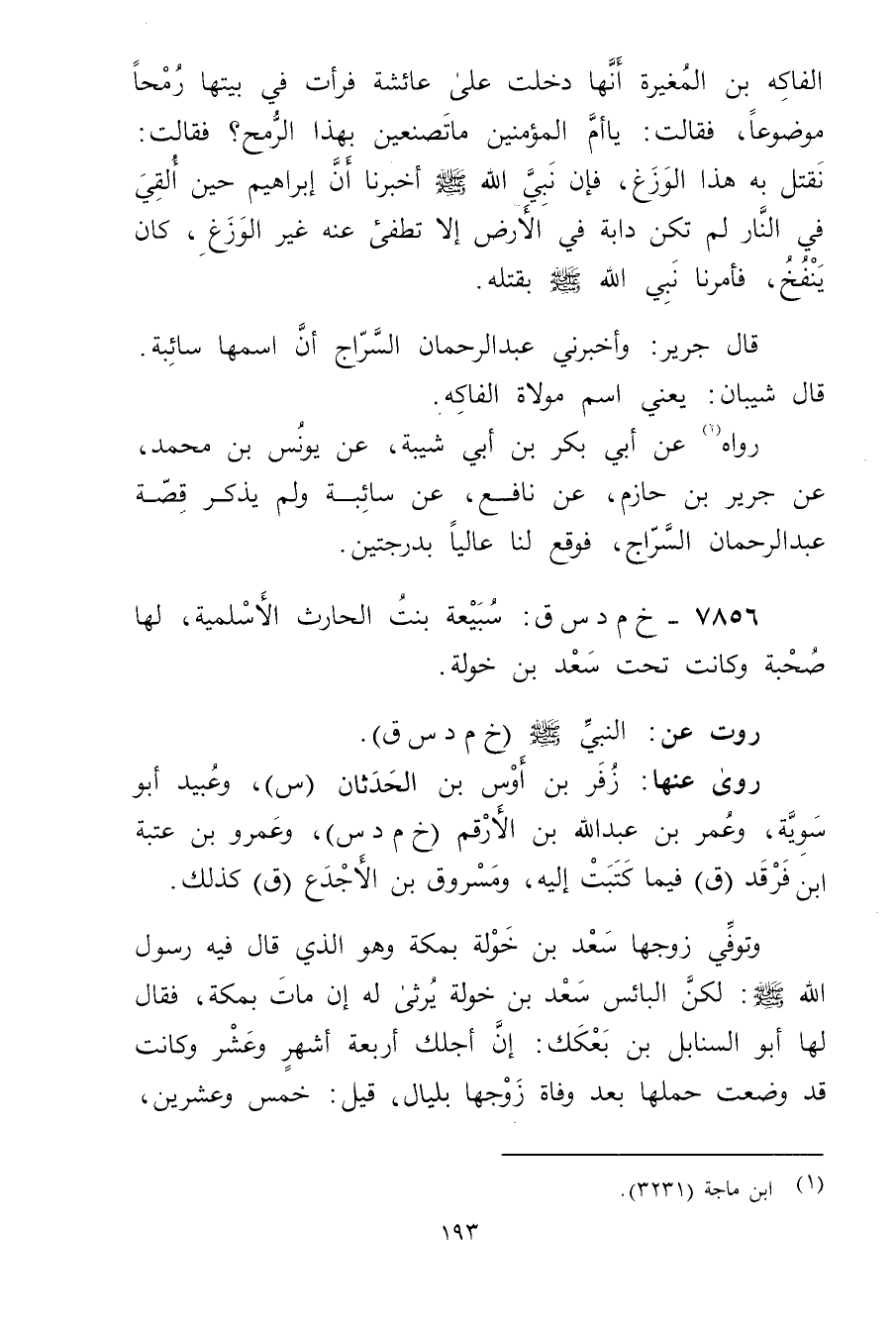 قال جَرِيرٌ: وأَخْبَرَنِي عَبْدُ الرَّحْمَنِ السَّرَّاجُ أَنَّ اسْمَهَا سَائِبَةُ. قال شَيْبَانُ: يَعْنِي اسْمَ مَوْلاةِ الْفَاكِهِ.