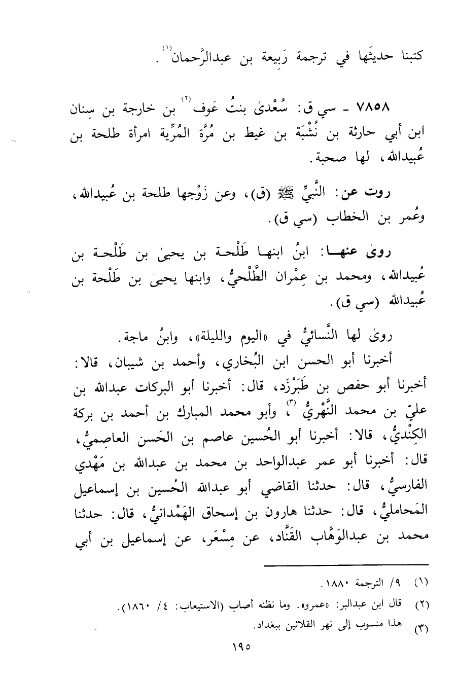 7858 - سي ق: سعدى بنت عوف (2) بن خارجة بن سنان ابن أَبي حارثة بْن نشبة بْن غيط بن مرة المرية امرأة طلحة بن عُبَيد الله، لها صحبة.