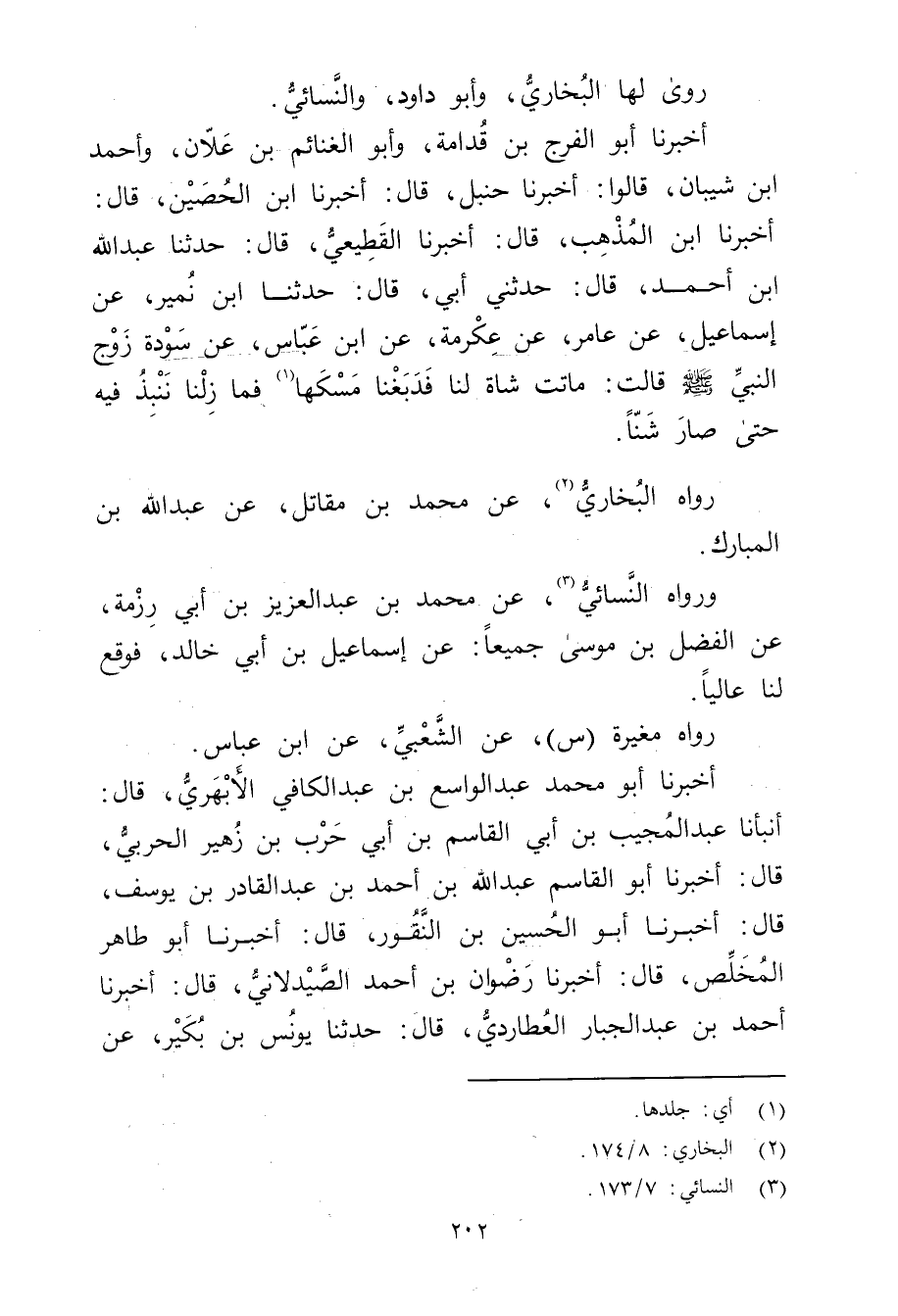 أخبرنا أَبُو الْفَرَجِ بْنُ قُدَامَةَ، وأَبُو الْغَنَائِمِ بْنُ عَلانَ، وأَحْمَدُ بْنُ شَيْبَانَ، قَالُوا: أَخْبَرَنَا حنبل، قال: أخبرنا ابن الحصين، قال: أخبرنا ابْنُ الْمُذْهِب، قال: أخبرنا القَطِيعِيّ، قال: حَدَّثَنَا عَبد اللَّهِ بْن أَحْمَدَ، قال: حَدَّثني أَبِي، قال: حَدَّثَنَا ابْنُ نُمَيْرٍ، عَنْ إِسْمَاعِيلَ، عَنْ عَامِرٍ، عَنْ عِكْرِمَةَ، عَنِ ابْنِ عَبَّاسٍ، عَنِ سَوْدَةَ زَوْجِ النَّبِيِّ صلى الله عليه وسلم قَالَتْ: مَاتَتْ شَاةٌ لنا فدبغنا مسكها (1) فمازلنا نَنْبِذُ فِيهِ حَتَّى صَارَ شَنًّا.