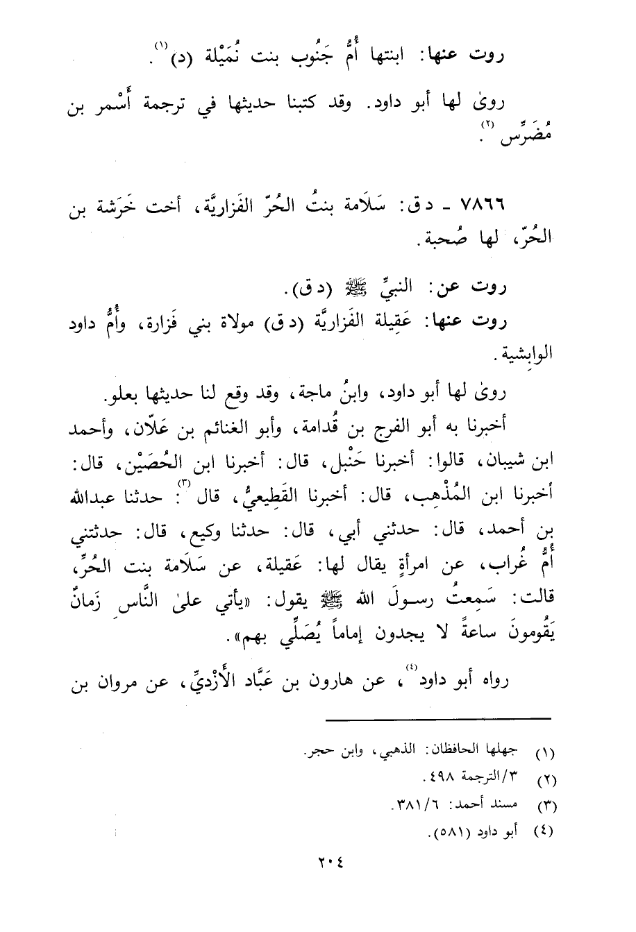أَخْبَرَنَا بِهِ أَبُو الْفَرَجِ بْنُ قُدَامَةَ، وأَبُو الْغَنَائِمِ بْنُ عَلانَ، وأَحْمَدُ بْنُ شَيْبَانَ، قَالُوا: أَخْبَرَنَا حنبل، قال: أخبرنا ابن الحصين، قال: أخبرنا ابْنُ الْمُذْهِب، قال: أخبرنا القَطِيعِيّ، قال (3) : حَدَّثَنَا عَبد اللَّهِ بْن أَحْمَدَ، قال: حَدَّثني أَبِي، قال: حَدَّثَنَا وكِيعٌ، قال: حَدَّثَتْنِي أُمُّ غُرَابٍ، عَنِ امْرَأَةٍ يُقَالُ لَهَا: عَقِيلَةُ، عَنْ سَلامَةَ بِنْتِ الْحُرِّ، قَالَتْ: سَمِعْتُ رَسُولَ اللَّهِ صلى الله عليه وسلم يَقُولُ: يَأْتِي عَلَى النَّاسِ زَمَانٌ يَقُومُونَ سَاعَةً لا يَجِدُونَ إِمَامًا يُصِلِّي بِهِمْ.