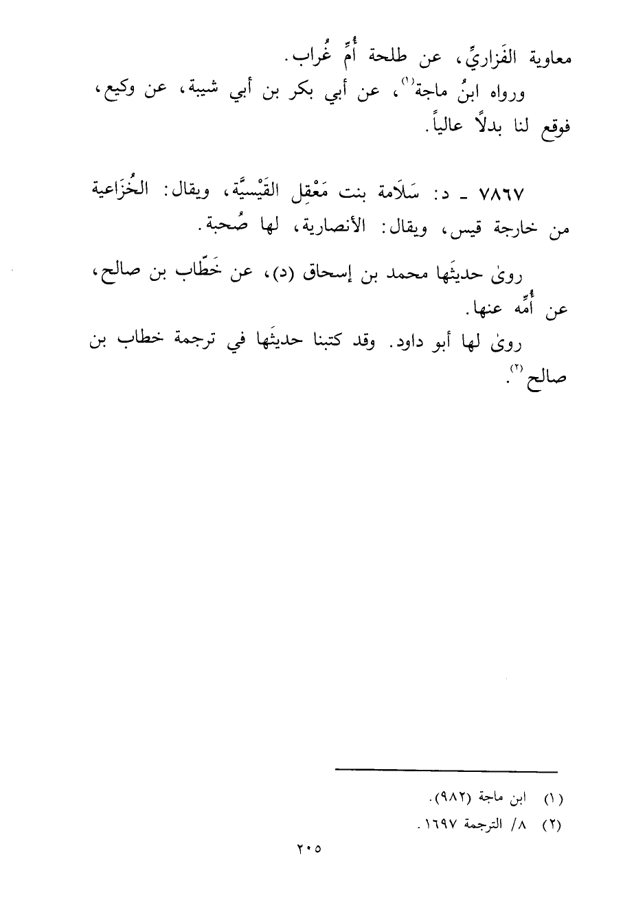 7867 - د: سلامة بنت معقل القيسية، ويُقال: الخزاعية من خارجة قيس، ويُقال: الأَنْصارِيّة، لها صحبة.