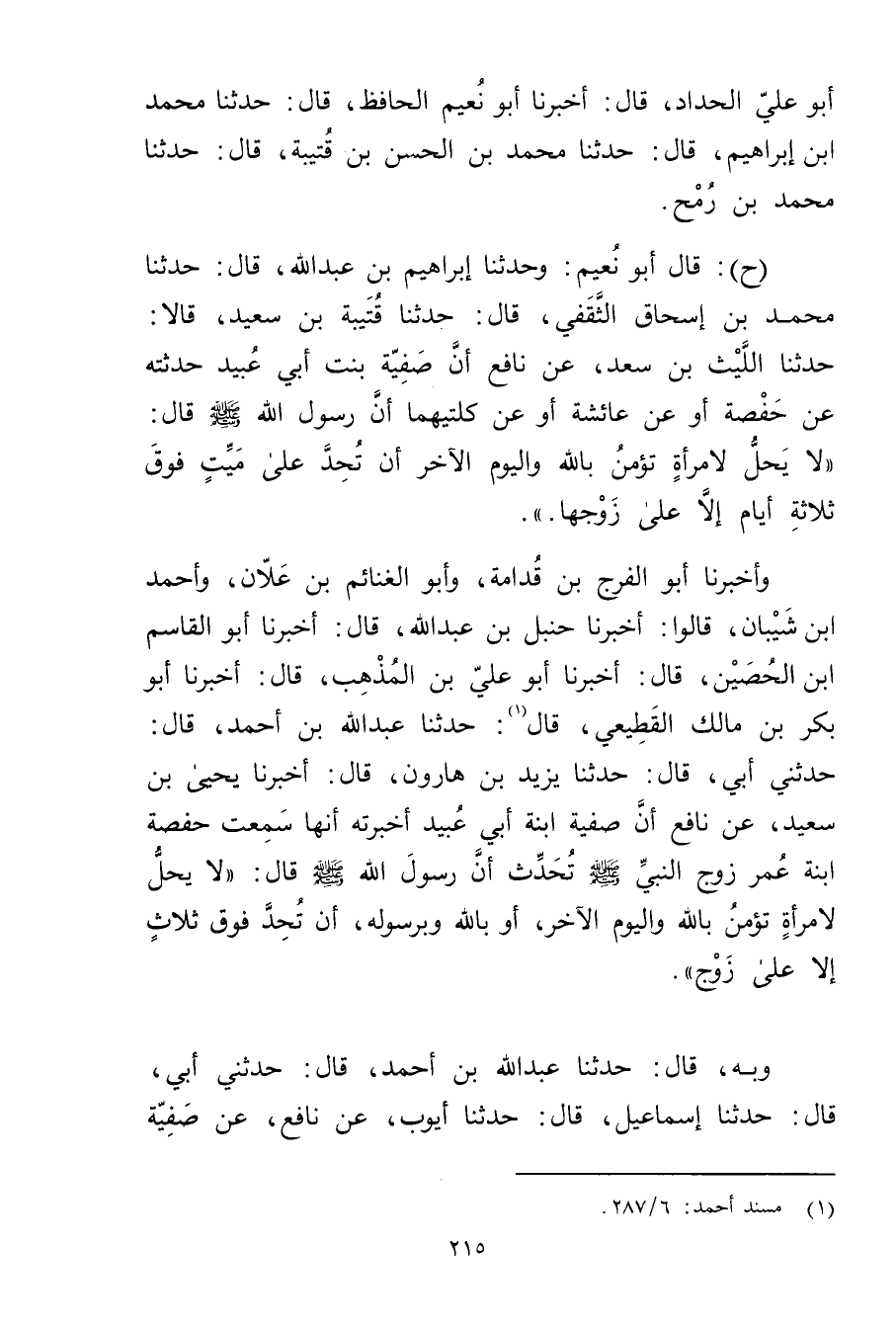 وأَخْبَرَنَا أَبُو الْفَرَجِ بْنُ قُدَامَةَ، وأَبُو الغنائم بْن علان، وأحمد بْن شَيْبَانَ، قَالُوا: أَخْبَرَنَا حَنْبَلُ بْنُ عَبد اللَّهِ، قال: أخبرنا أَبُو القاسم ابن الحصين، قال: أخبرنا أَبُو علي بْن المذهب، قال: أَخْبَرَنَا أبو بكر بْن مالك القَطِيعِيّ، قال (1) : حَدَّثَنَا عَبد اللَّهِ بْن أَحْمَدَ، قال: حَدَّثني أبي، قال: حَدَّثَنَا يزيد بْن هارون، قال: أَخْبَرَنَا يَحْيَى بْنُ سَعِيد، عَنْ نَافِعٍ أَنَّ صَفِيَّةَ ابْنَةَ أَبِي عُبَيد أَخْبَرَتْهُ أَنَّهَا سَمِعَتْ حَفْصَةَ ابْنَةَ عُمَر زَوْجَ النَّبِيِّ صلى الله عليه وسلم تُحَدِّثُ أَنَّ رَسُول اللَّهِ صلى الله عليه وسلم قال: لا يَحِلُّ لامْرَأَةٍ تُؤْمِنُ بِاللَّهِ والْيَوْمِ الآخِرِ، أَوْ بِاللَّهِ وبِرَسُولِهِ، أَنْ تُحِدَّ فَوْقَ ثَلاثٍ إِلا عَلَى زَوْجٍ.
