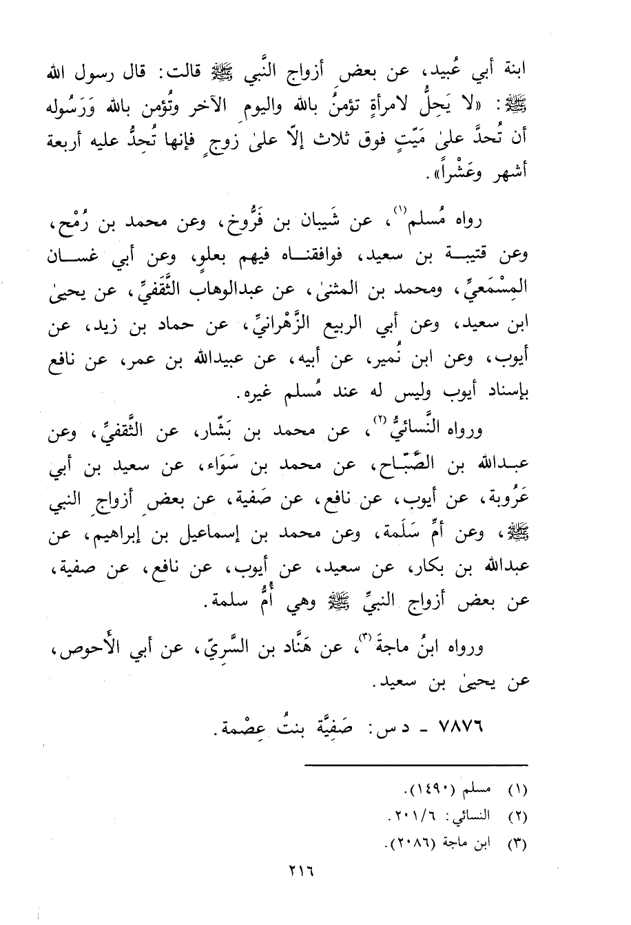 ورَوَاهُ النَّسَائي (2) ، عَنْ مُحَمَّدِ بْنِ بَشَّارٍ، عَنِ الثَّقَفِيِّ، وعَنْ عَبد اللَّهِ بْنِ الصَّبَّاحِ، عَنْ مُحَمَّدِ بْنِ سَوَاءٍ، عَنْ سَعِيد بْنِ أَبي عَرُوبَة، عَن ايوب، عَنْ نَافِعٍ، عَنْ صَفِيَّةَ، عَنْ بَعْضِ أَزْوَاجِ النَّبِيِّ صَلَّى اللَّهُ عَلَيْهِ وسلم، وعَنْ أُمِّ سَلَمَةَ، وعَنْ محمد بن إسماعيل بن إبراهيم، عَنْ عَبد اللَّهِ بْنِ بَكَّارٍ، عَنْ سَعِيد، عَنْ أَيُّوبَ، عَنْ نافع، عن صفية، عن بضع أَزْوَاجِ النَّبِيِّ صَلَّى اللَّهُ عَلَيْهِ وسلم وهِيَ أُمُّ سَلَمَةَ.