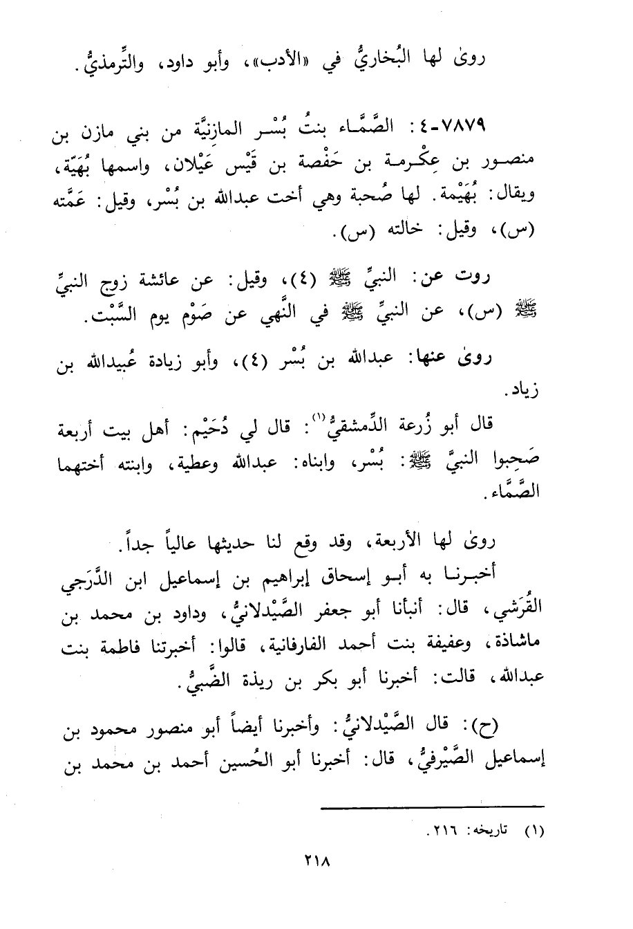 7879 - 4: الصماء بنت بسر المازنية من بني مازن بْن منصور بْن عكرمة بْن حفصة بن قيس عيلان، واسمها بهية، ويُقال: بهيمة. لها صحبة وهي أخت عَبد الله بن بسر، وقيل: عمته (س) ، وقيل: خالته (س) .