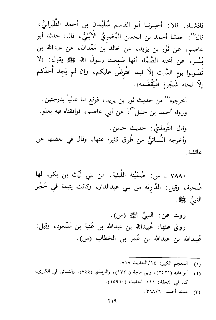 فَاذشَاهِ. قَالا: أخبرنا أَبُو الْقَاسِمِ سُلَيْمان بْنُ أَحْمَدَ الطَّبَرَانِيُّ، قال (1) : حَدَّثَنَا أَحْمَدُ بْنُ الْحَسَنِ الْمُضَرِيُّ الأُبُلِّيُّ، قال: حَدَّثَنَا أَبُو عَاصِمٍ، عَنْ ثَوْرِ بْنِ يَزِيدَ، عَنْ خَالِدِ بْنِ مَعْدَانَ، عَنْ عَبد اللَّهِ بْن بسر، عَنْ أخته الصَّمَّاءِ أَنَّهَا سَمِعَتْ رَسُولَ اللَّهِ صَلَّى اللَّهُ عَلَيْهِ وسَلَّمَ يقول: لا تَصُومُوا يَوْمَ السَّبْتِ إِلا فِيمَا افْتُرِضَ عَلَيْكُمْ، وإِنْ لَمْ يَجِدْ أَحَدُكُمْ إِلا لِحَاءَ شَجَرَةٍ فَلْيَقْضِمْهُ.