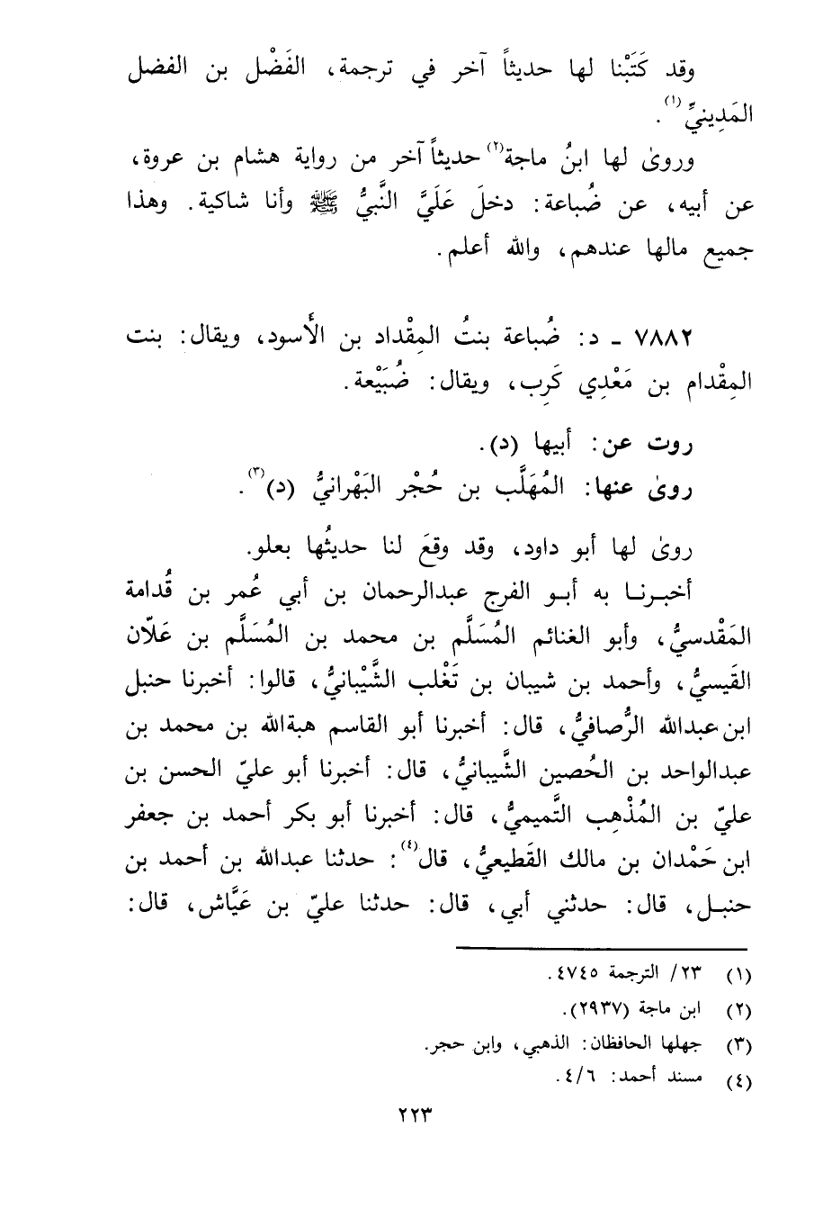 7882 - د: ضباعة بنت المقداد بن الأسود، ويُقال: بنت المقدام بن مَعْدِي كَرِب، ويُقال: ضبيعة.