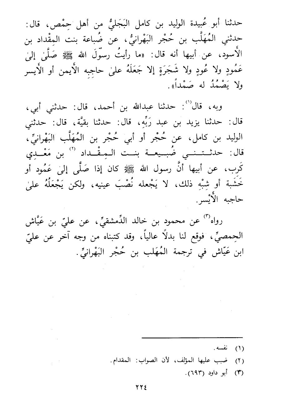 حَدَّثَنَا أَبُو عُبَيدة الْوَلِيد بْن كَامِلٍ الْبَجَلِيُّ مِنْ أَهْلِ حِمْصَ، قال: حَدَّثَنِي الْمُهَلَّبُ بْنُ حَجَرٍ الْبَهْرَانِيِّ، عَنْ ضُبَاعَةَ بِنْتِ الْمِقْدَادِ بْنِ الأَسْوَدِ، عَن أَبِيهَا أَنَّهُ قال: مَا رَأَيْتُ رَسُولَ اللَّهِ صَلَّى اللَّهُ عليه وسلم صلى إِلَى عَمُودٍ ولا عُودٍ ولا شَجَرَةٍ إِلا جَعَلَهُ عَلَى حَاجِبِهِ الأَيْمَنِ أَوِ الأَيْسَرِ ولا يَصْمُدُ لَهُ صَمْدًا.