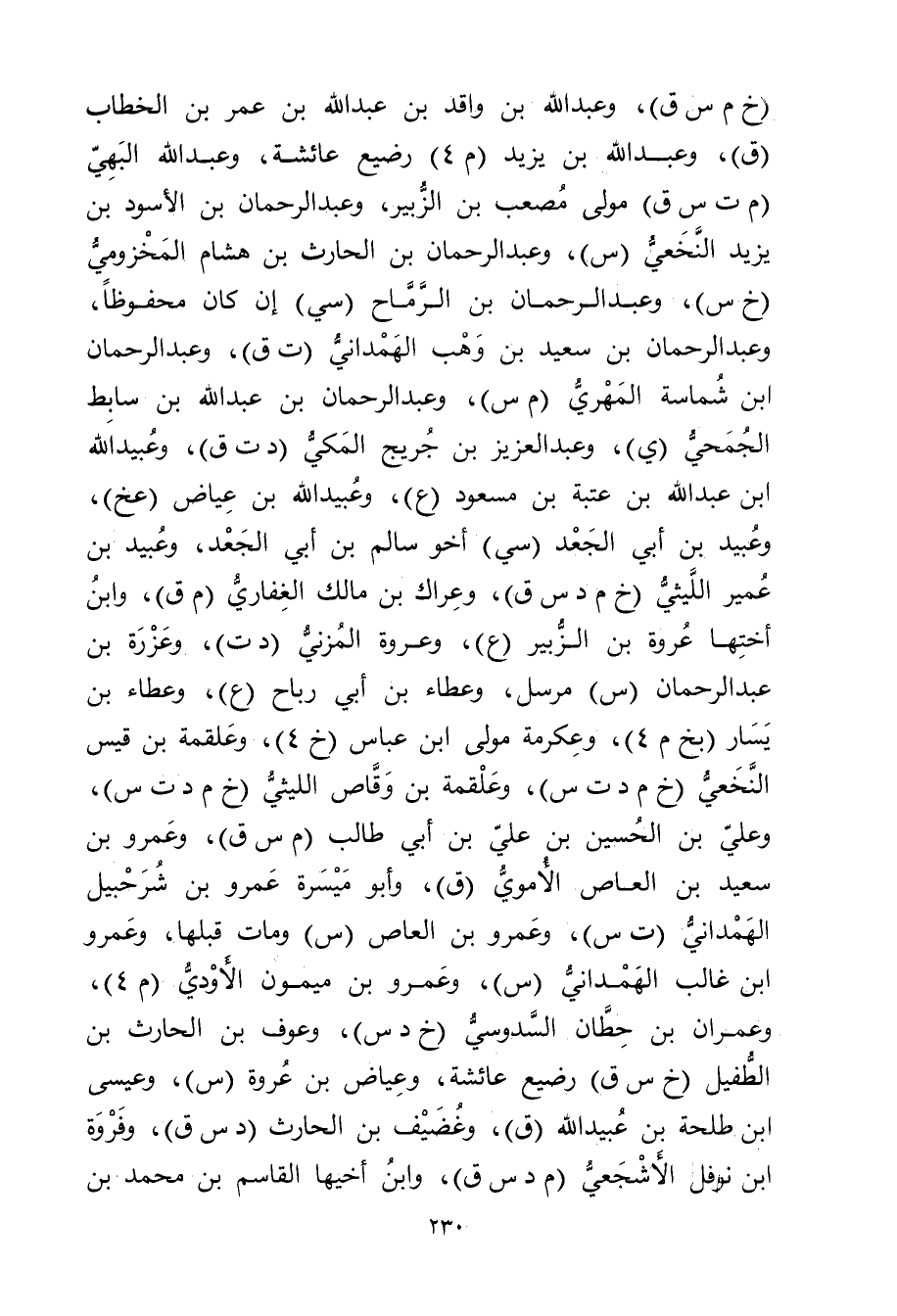 (خ م س ق) ، وعبد الله بْن واقد بْن عَبد اللَّهِ بْن عُمَر بْن الخطاب (ق) ، وعبد الله بْن يزيد (م 4) رضيع عائشة، وعبد الله البهي (م ت س ق) ، مولى مصعب بن الزبير، وعبد الرحمن بْن الأسود بْن يزيد النخعي (س) ، وعبد الرحمن بن الحارث بن هشام المخزومي (خ س) ، وعبد الرحمن بن الرماح (سي) إن كان محفوظا، وعَبْد الرحمن بْن سَعِيد بْن وهب الهمداني (ت ق) ، وعبد الرحمن ابن شِِمَاسَةَ المهري (م س) ، وعبد الرَّحْمَنِ بْن عَبد اللَّهِ بْن سابط الجمحي (ي) ، وعبد العزيز بن جُرَيْج المكي (د ت ق) ، وعُبَيد الله بْن عَبد الله بْن عتبة بْن مسعود (ع) ، وعُبَيد الله بن عياض (عخ) ، وعُبَيد بن أَبي الجعد (سي) أخو سالم بن أَبي الجعد، وعُبَيد بن عُمَير الليثي (خ م د س ق) ، وعراك بن مالك الغفاري (م ق) ، وابن أختها عروة بن الزبير (ع) ، وعروة المزني (د ت) ، وعزرة بن عبد الرحمن (س) مرسل، وعطاء بن أَبي رباح (ع) ، وعطاء بْن يسار (بخ م 4) ، وعكرمة مولى ابن عباس (خ 4) ، وعلقمة بن قيس النخعي (خ م د ت س) ، وعلقمة بْن وقاص الليثي (خ م د ت س) ، وعلي بْن الْحُسَيْن بْن عَلِيٍّ بْن أَبي طالب (م س ق) ، وعَمْرو بن سَعِيد بن العاص الأُمَوِي (ق) ، وأبو ميسرة عَمْرو بن شرحبيل الهمداني (ت س) ، وعَمْروبن العاص (س) ومات قبلها، وعَمْرو ابن غالب الهمداني (س) ، وعَمْرو بن ميمون الأَودِيّ (م 4) ، وعِمْران بن حطان السدوسي (خ دس) ، وعوف بْن الْحَارِث بْن الطفيل (خ س ق) ، رضيع عائشة، وعياض بن عروة (س) ، وعيسى ابن طلحة بْن عُبَيد اللَّه (ق) ، وغضيف بْن الْحَارِث (د س ق) ، وفروة ابن نوفل الأشجعي (م د س ق) ، وابن أخيها القاسم بن مُحَمَّد بْن