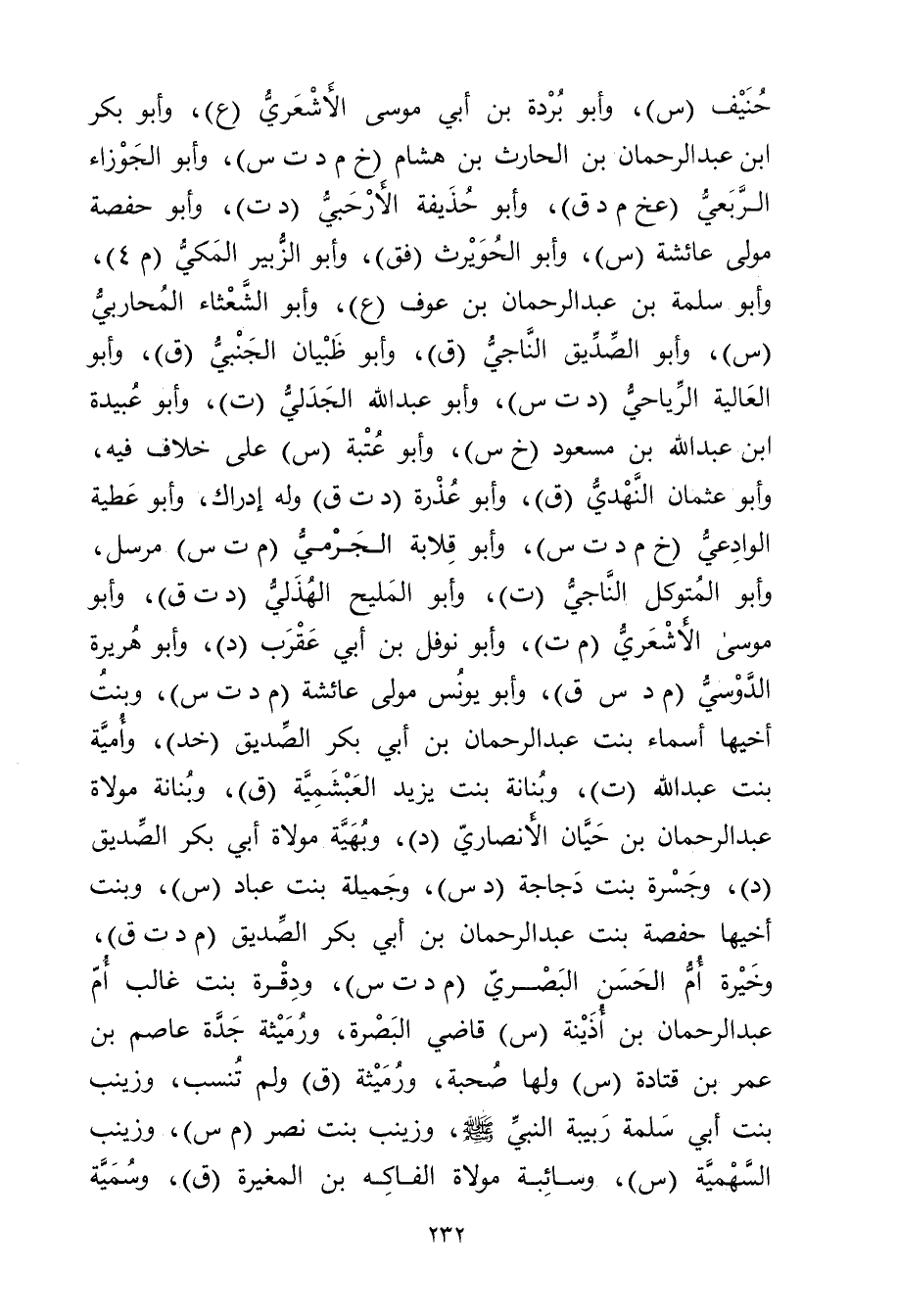 حنيف (س) ، وأبو بردة بن أَبي موسى الأشعري (ع) ، وأبو بكر بْن عَبْد الرحمن بْن الحارث بْن هشام (خ م د ت س) ، وأبو الجوزاء الربعي (عخ م د ق) ، وأبو حذيفة الأرحبي (د ت) ، وأبو حفصة مولى عائشة (س) ، وأبو الحويرث (فق) ، وأبو الزبير المكي (م 4) ، وأبو سلمة بن عبد الرحمن بْن عوف (ع) ، وأَبُو الشعثاء المحاربي (س) ، وأَبُو الصديق الناجي (ق) ، وأبو ظبيان الجنبي (ق) ، وأبو العالية الرياحي (د ت س) ، وأَبُو عَبْد الله الجدلي (ت) ، وأبو عُبَيدة ابن عَبد الله بْن مسعود (خ س) ، وأبو عتبة (س) على خلاف فيه، وأبو عثمان النهدي (ق) ، وأبو عذرة (د ت ق) وله إدراك، وأبو عطية الوادعي (خ م د ت س) ، وأَبُو قلابة الجرمي (م ت س) مرسل، وأبو المتوكل الناجي (ت) ، وأبو المليح الهذلي (د ت ق) ، وأبو موسى الأشعري (م ت) ، وأبو نوفل بن أَبي عقرب (د) ، وأبو هُرَيْرة الدوسي (م د س ق) ، وأبو يونس مولى عائشة (م د ت س) ، وبنت أخيها أسماء بنت عبد الرحمن بْنِ أَبي بكر الصديق (خد) ، وأمية بنت عَبد الله (ت) ، وبنانة بنت يزيد العبشمية (ق) ، وبنانة مولاة عبد الرحمن بن حيان الأَنْصارِيّ (د) ، وبهية مولاة أبي بكر الصديق (د) ، وجسرة بنت دجاجة (دس) ، وجميلة بنت عباد (س) ، وبنت أخيها حفصة بنت عبد الرحمن بْن أَبي بكر الصديق (م د ت ق) ، وخيرة أم الحسن البَصْرِيّ (م د ت س) ، ودقرة بنت غالب أم عبد الرحمن بن أذينة (س) قاضي البصرة، ورميثة جدة عاصم بْن عُمَر بْن قتادة (س) ولها صحبة، ورميثة (ق) ولم تنسب، وزينب بنت أبي سلمة ربيبة النَّبِيّ صَلَّى اللَّهُ عَلَيْهِ وسلم، وزينب بنت نصر (م س) ، وزينب السهمية (س) ، وسائبة مولاة الفاكه بن المغيرة (ق) ، وسمية