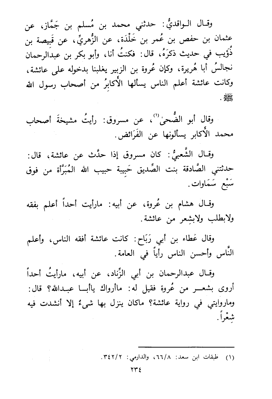 وَقَال الْوَاقِدِيُّ: حَدَّثَنِي مُحَمَّدُ بْنُ مسلم بن جماز، عن عثمان بْن حفص بْن عُمَر بْن خلدة، عن الزُّهْرِيّ، عن قبيصة بن ذؤيب في حديث ذكره، قال: كنت أنا، وأبو بكر بن عبد الرحمن نجالس أبا هُرَيْرة، وكان عروة بن الزبير يغلبنا بدخوله على عائشة، وكانت عائشة أعلم الناس يسألها الأكابر من أصحاب رَسُول اللَّهِ صلى الله عليه وسلم.