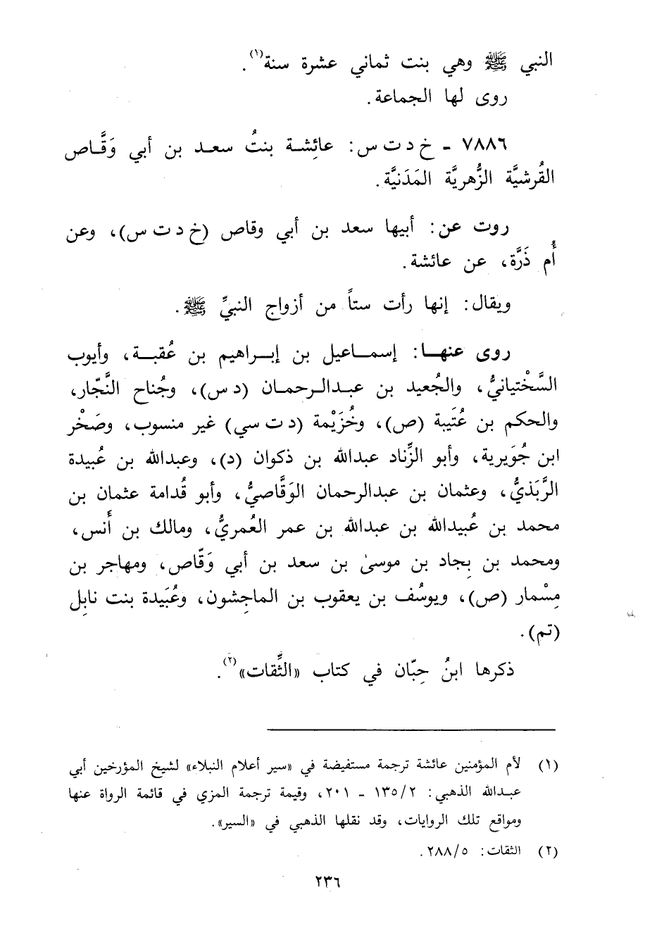 7886 - خ د ت س: عائشة بنت سعد بن أَبي وقاص القرشية الزُّهْرِيّة المدنية.