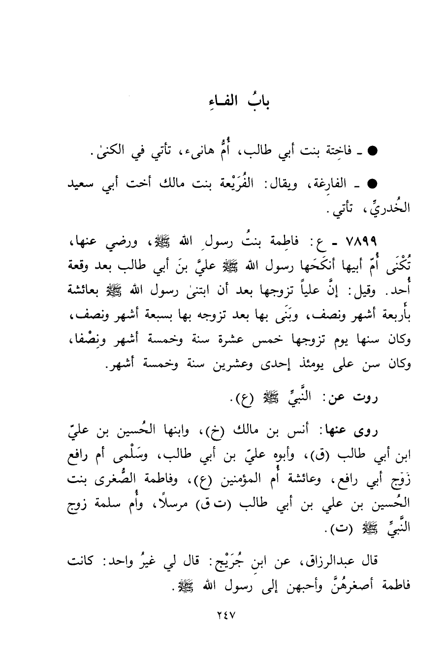 7899 - ع: فاطمة بنت رسول اللَّهِ صلى الله عليه وسلم، ورضي عنها، تكنى أم أبيها أنكحها رسول الله صلى الله عَلَيْهِ وسَلَّمَ علي بْن أَبي طالب بعد وقعة أحد.