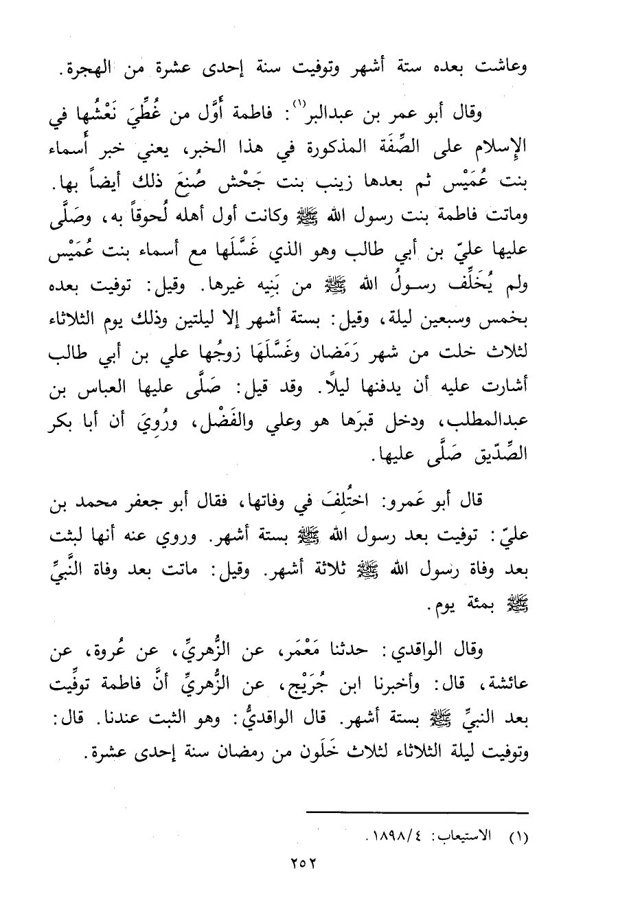 وَقَال أَبُو عُمَر بْن عَبد الْبَرِّ (1) : فاطمة أول من غطي نعشها في الإسلام على الصفة المذكورة في هذا الخبر، يعني خبر أسماء بنت عميس ثم بعدها زينب بنت جحش صنع ذلك أيضا بها. وماتت فاطمة بنت رَسُول اللَّهِ صَلَّى اللَّهُ عليه وسلم وكانت أول أهله لحوقا به، وصلى عليها علي بن أَبي طالب وهو الذي غسلها مع أسماء بنت عميس ولم يخلف رسول الله صلى الله عليه وسلم من بنيه غيرها.