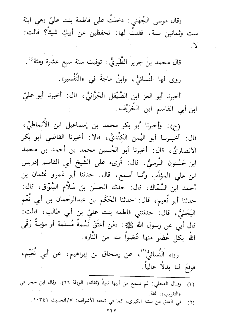 (ح) : وأَخْبَرَنَا أَبُو بَكْرِ محمد بن إسماعيل ابْنُ الأَنْمَاطِيِّ، قال: أَخْبَرَنَا أَبُو اليُمْنِ الْكُنْدِيُّ، قَالا: أَخْبَرَنَا الْقَاضِي أَبُو بَكْرٍ الأَنْصارِيّ، قال: أَخْبَرَنَا أَبُو الْحُسَيْنِ مُحَمَّدُ بْنُ أَحْمَدَ بن محمد ابن حَسْنُونَ النَّرْسِيُّ، قال: قُرِئَ عَلَى الشيخ أبي القاسم إدريس ابن عَلِيٍّ الْمُؤَدِّبِ وأَنَا أَسْمَعُ، قال: حَدَّثَنَا أبو عَمْرو عثمان بْن أَحْمَدَ بْنِ السَّمَّاكِ، قال: حَدَّثَنَا الْحَسَنُ بْنُ سَلامٍ السَّوَّاقُ، قال: حَدَّثَنَا أَبُو نعيم، قال: حَدَّثَنَا الحكم بن عبد الرحمن بن أَبي نُعْمٍ الْبَجَلِيُّ، قال: حَدَّثَتْنِي فاطمة بنت علي بن أَبي طَالِبٍ، قَالَتْ: قال أَبِي عَنْ رَسُول اللَّهِ صلى الله عليه وسلم: مَنْ أَعْتَقَ نَسَمَةً مُسْلِمَةً أَوْ مُؤْمِنَةً وقَى اللَّهُ بِكُلِّ عُضْوٍ مِنْهَا عُضْوًا مِنْهُ مِنَ النَّارِ.