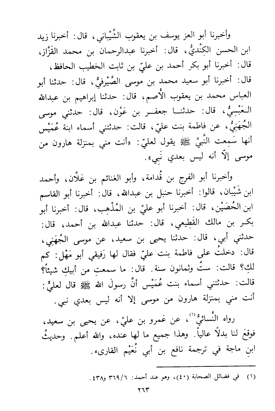 وأَخْبَرَنَا أَبُو الْعِزِّ يُوسُفُ بْنُ يعقوب الشيباني، قال: أَخْبَرَنَا زيد ابن الحسن الكندي، قال: أَخْبَرَنَا عَبْد الرَّحْمَنِ بْنُ مُحَمَّدٍ الْقَزَّازُ، قال: أَخْبَرَنَا أَبُو بَكْرٍ أَحْمَدُ بْنُ عَلِيِّ بْنِ ثَابِتٍ الْخَطِيبُ الْحَافِظُ، قال: أَخْبَرَنَا أَبُو سَعِيد مُحَمَّد بْن مُوسَى الصيرفي، قال: حَدَّثَنَا أَبُو الْعَبَّاسِ مُحَمَّدُ بْنُ يَعْقُوبَ الأَصَمُّ، قال: حَدَّثَنَا إِبْرَاهِيمُ بْنُ عَبد اللَّهِ الْعَبْسِيُّ، قال: حَدَّثَنَا جَعْفَرُ بْنُ عَوْنٍ، قال: حَدَّثَنِي مُوسَى الْجُهَنِيُّ، عَنْ فَاطِمَةَ بِنْتِ عَلِيٍّ، قَالَتْ: حَدَّثَتْنِي أَسْمَاءُ ابْنَةُ عُمَيْسٍ أَنَّهَا سَمِعَتِ النَّبِيَّ صلى اللَّهُ عَلَيْهِ وسَلَّمَ يَقُولُ لِعَلِيٍّ: أَنْتَ مِنِّي بِمَنْزِلَةِ هَارُونَ مِنْ مُوسَى إِلا أَنَّهُ لَيْسَ بَعْدِي نَبِيٌّ.