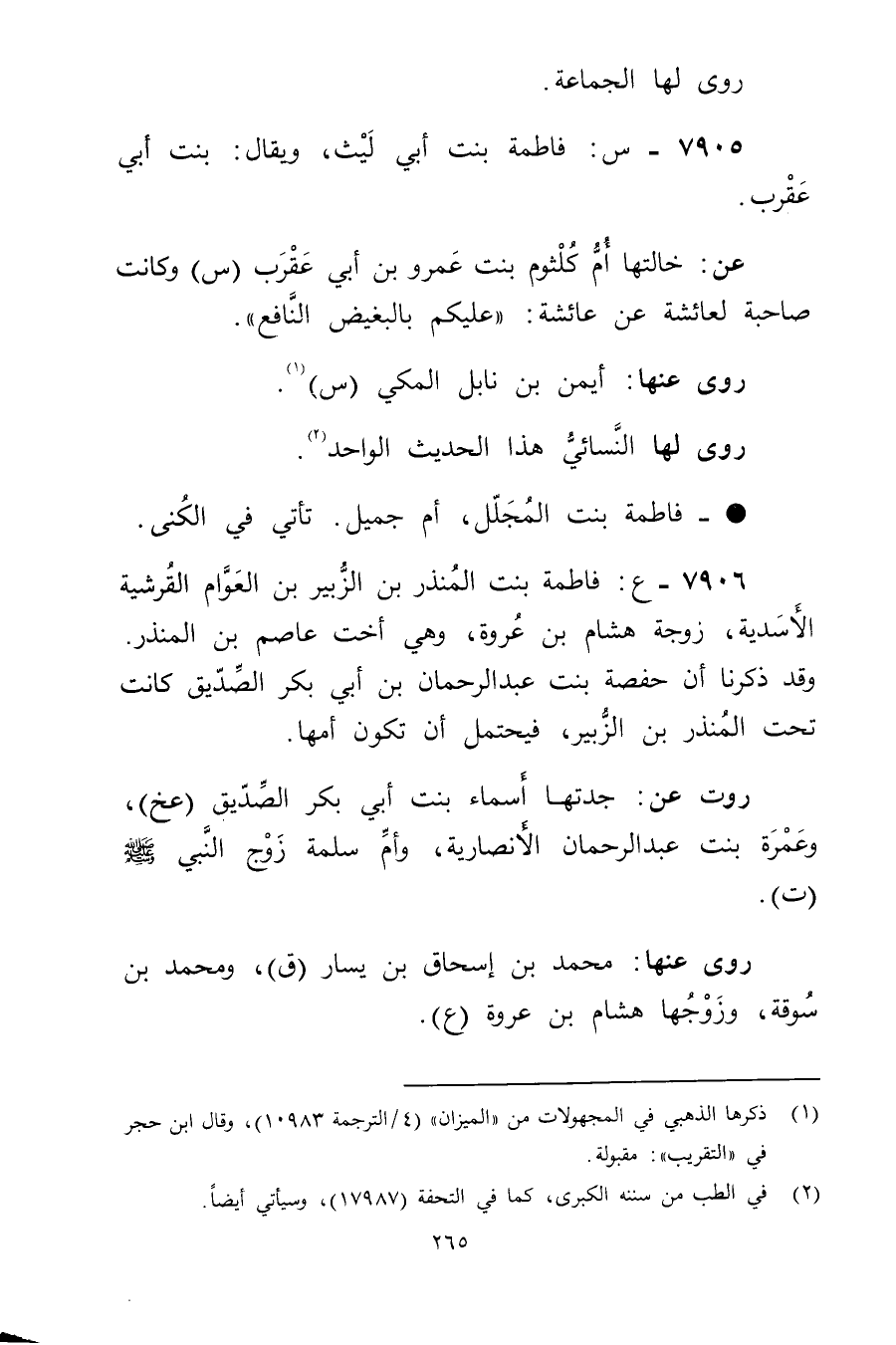 7906 - ع: فاطمة بْنت المنذر بْن الزبير بن العوام القرشية الأسدية، زوجة هشام بن عروة، وهي أخت عاصم بن المنذر. وقد ذكرنا أن حفصة بنت عبد الرحمن بن أَبي بكر الصديق كانت