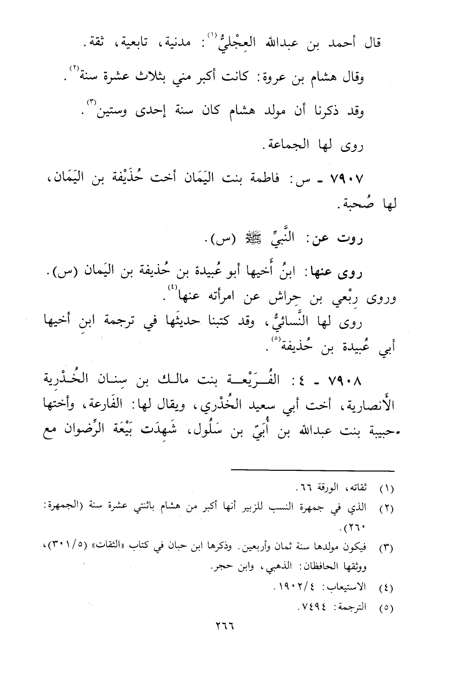 7908 - 4: الفريعة بنت مالك بن سنان الخُدْرِيّة الأَنْصارِيّة، أخت أبي سَعِيد الخُدْرِيّ، ويُقال لها: الفارعة، وأختها - حبيبة بنت عَبد الله بن أَبي بن سلول، شهدت بيعة الرضوان مع