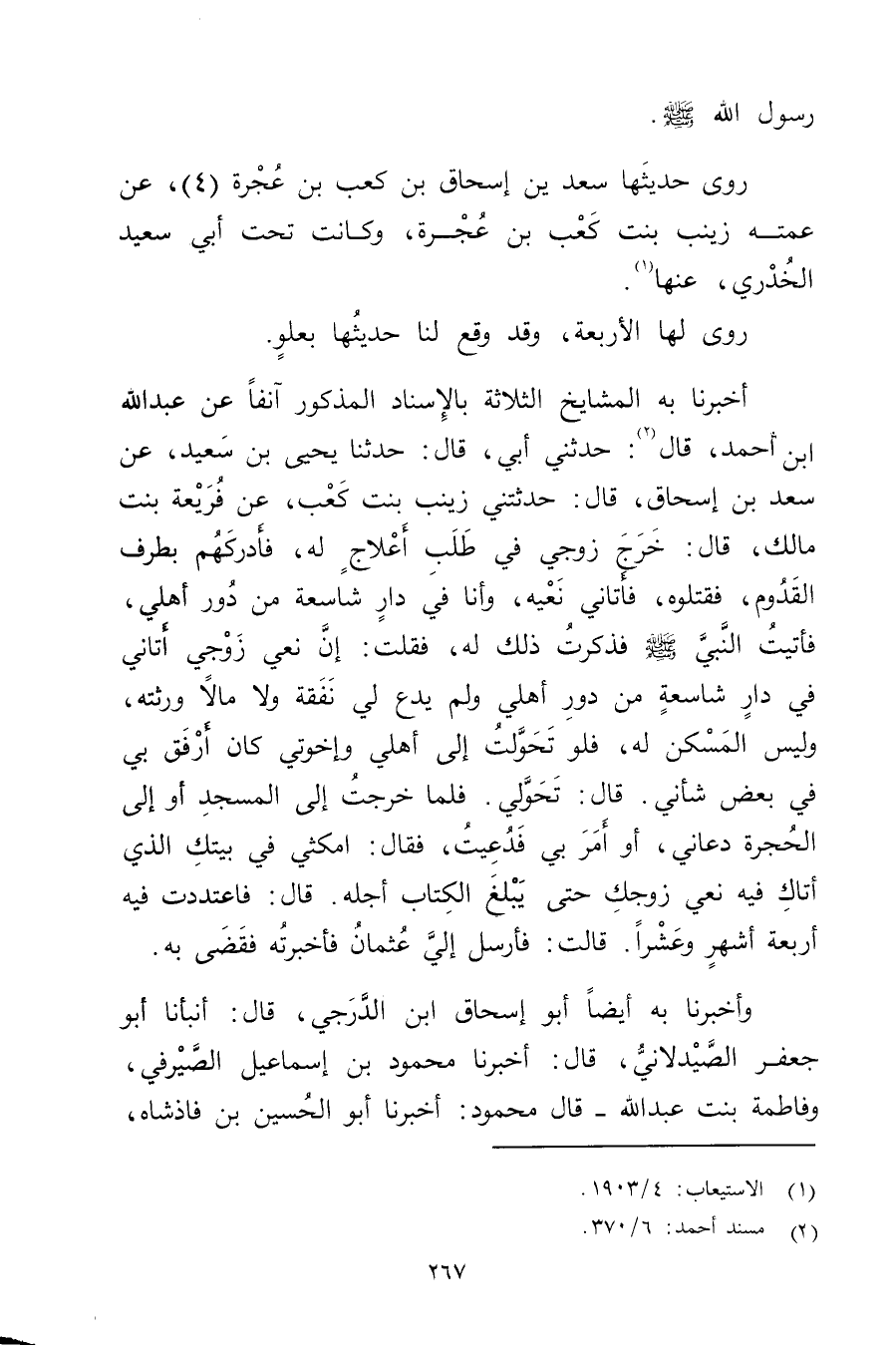 أخبرنا بِهِ الْمَشَايِخُ الثَّلاثَةُ بِالإِسْنَادِ الْمَذْكُورِ آنِفًا عَنْ عَبد اللَّهِ بْن أَحْمَدَ، قال (2) : حَدَّثني أَبِي، قال: حَدَّثَنَا يَحْيَى بْنُ سَعِيد، عَنْ سَعْدِ بْنِ إِسْحَاقَ، قال: حَدَّثَتْنِي زَيْنَبُ بِنْتُ كَعْبٍ، عن فريعة بنت مالك، قال: خَرَجَ زَوْجِي فِي طَلَبِ أَعْلاجٍ لَهُ، فَأَدْرَكَهُمْ بِطَرْفِ الْقَدُومِ، فَقَتَلُوهُ، فَأَتَانِي نَعْيُهُ، وأَنَا فِي دَارٍ شَاسِعَةٍ مِنْ دُورِ أَهْلِي، فَأَتَيْتُ النَّبِيُّ صلى الله عليه وسلم فَذَكَرْتُ ذَلِكَ لَهُ، فَقُلْتُ: إِنَّ نَعْيَ زَوْجِي أَتَانِي فِي دَارٍ شَاسِعَةٍ مِنْ دُورِ أَهْلِي ولَمْ يَدَعْ لِي نَفَقَةً ولا مَالا ورِثْتُهُ، ولَيْسَ الْمَسْكَنُ لَهُ، فَلَوْ تَحَوَّلْتُ إِلَى أَهْلِي وإخِوْتَيِ كَانَ أَرْفَقَ بِي فِي بَعْضِ شَأْنِي. قال: تَحَوَّلِي. فَلَمَّا خَرَجْتُ إِلَى الْمَسْجِدِ أَوْ إِلَى الْحُجْرَةِ دَعَانِي، أَوْ أَمَرَ بِي فَدُعِيتُ، فَقَالَ: امْكُثِي فِي بَيْتِكِ الَّذِي أَتَاكِ فِيهِ نَعْيُ زَوْجِكِ حَتَّى يَبْلُغَ الْكِتَابُ أَجَلَهُ. قال: فَاعْتَدَدْتُ فِيهِ أَرْبَعَةَ أَشْهُرٍ وعَشْرًا. قَالَتْ: فَأَرْسَلَ إِلَيَّ عُثْمَانُ فَأَخْبَرْتُهُ فَقَضَى بِهِ.