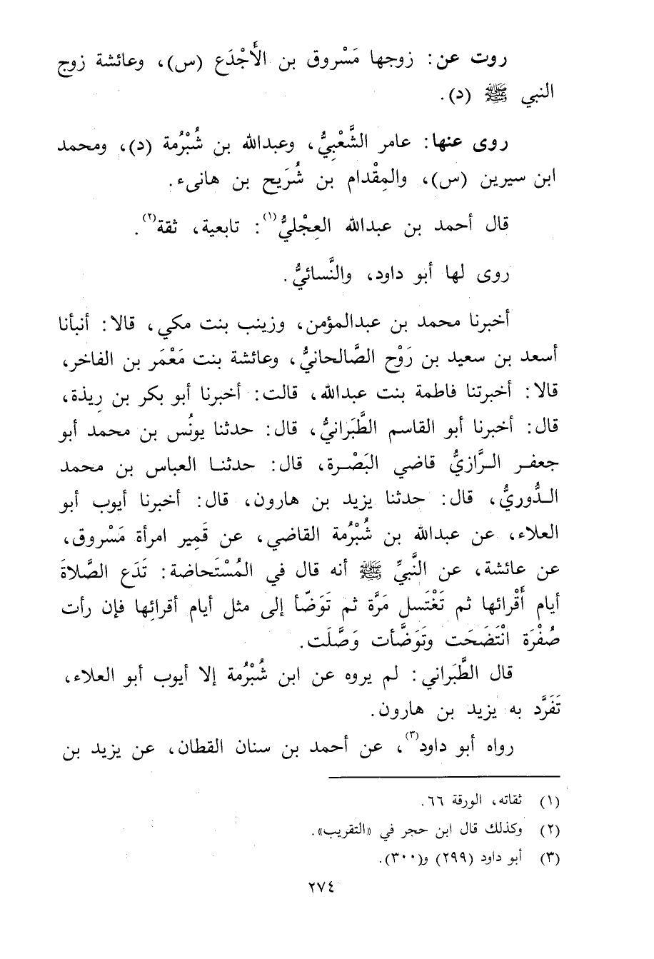 أخبرنا محمد بن عبد المؤمن، وزَيْنَبُ بِنْتُ مَكِّيٍّ، قَالا: أَنَبَأَنَا أَسْعَدَ بْنِ سَعِيد بْنِ رَوْحٍ الصَّالِحَانِيُّ، وعَائِشَةُ بِنْتُ مَعْمَرِ بْنِ الْفَاخِرِ، قَالا: أخَبْرَتْنَا فَاطِمَةُ بِنْتُ عَبد اللَّهِ، قَالَتْ: أخبرنا أَبُو بَكْرِ بْنُ رِيذَةَ، قال: أخبرنا أَبُو الْقَاسِمِ الطَّبَرَانِيُّ، قال: حَدَّثَنَا يُونُسُ بْنُ مُحَمَّدٍ أَبُو جَعْفَرٍ الرَّازِيُّ قَاضِي الْبَصْرَةِ، قال: حَدَّثَنَا الْعَبَّاسُ بْنُ مُحَمَّدٍ الدُّورِيُّ، قال: حَدَّثَنَا يزيد بْن هارون، قال: أخبرنا أَيُّوبُ أَبُو الْعَلاءِ، عَنْ عَبد اللَّهِ بْن شبرمة القاضي، عَنْ قَمِيرَ امْرَأَةِ مَسْرُوقٍ، عَنْ عَائِشَةَ، عَنِ النَّبِيِّ صَلَّى اللَّهُ عَلَيْهِ وسَلَّمَ أَنَّهُ قال فِي الْمُسْتَحَاضَةِ: تَدَعُ الصَّلاةَ أَيَّامَ أَقْرَائِهَا ثم تغتسل مرة ثم توضأ إِلَى مِثْلِ أَيَّامِ أَقْرَائِهَا فَإِنْ رَأَتْ صُفْرَةً انْتَضَحَتْ وتَوَضَّأَتْ وصَلَّتْ.