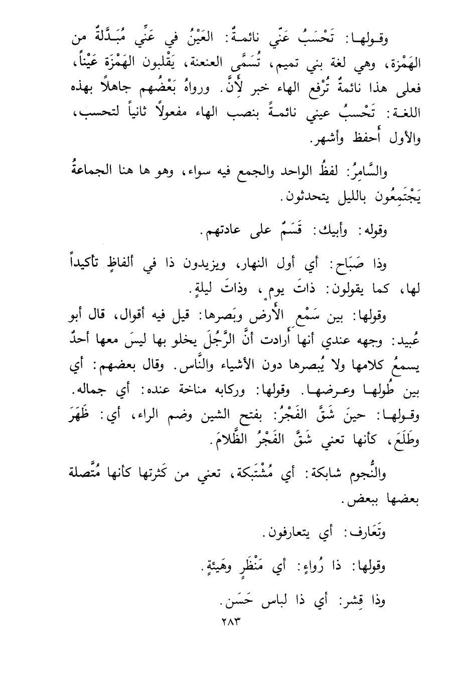 وقولها: تحسب عني نائمة: العين في عني مبدلة من الهمزة، وهي لغة بني تميم، تسمى العنعنة، يقلبون الهمزة عينا، فعلى هذا نائمة ترفع الهاء خبر لأن. ورواه بعضهم جاهلا بهذه اللغة: تحسب عيني نائمة بنصب الهاء مفعولا ثانيا لتحسب، والأول أحفظ وأشهر.