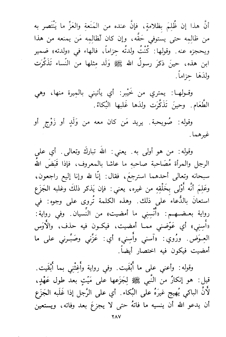 أن هذا أن ظلم بظلامة، فإن عنده من المنعة والعز ما ينتصر به من ظالمه حتى يستوفي حقه، وإن كان لظالمه من يمنعه من هذا ويحجزه عنه. وقولها: كنت ولدته حزاما، فالهاء في " ولدته" ضمير ابن هذه، حين ذكر رسول الله صلى الله عليه وسلم ولد مثلها من النساء تذكرت ولدها حزاما.