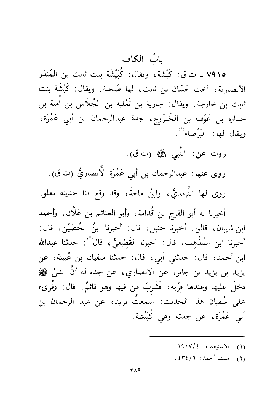 7915 - ت ق: كبشة، ويُقال: كبيشة بنت ثابت بن المنذر الأَنْصارِيّة، أخت حسان بن ثابت، لها صحبة. ويُقال: كبشة بنت ثابت بن خارجة، ويُقال: جارية بن ثعلبة بن الجلاس بن أمية بن جدارة بن عوف بن الخزرج، جدة عبد الرحمن بن أَبي عَمْرة، ويُقال لها: البرصاء (1) .