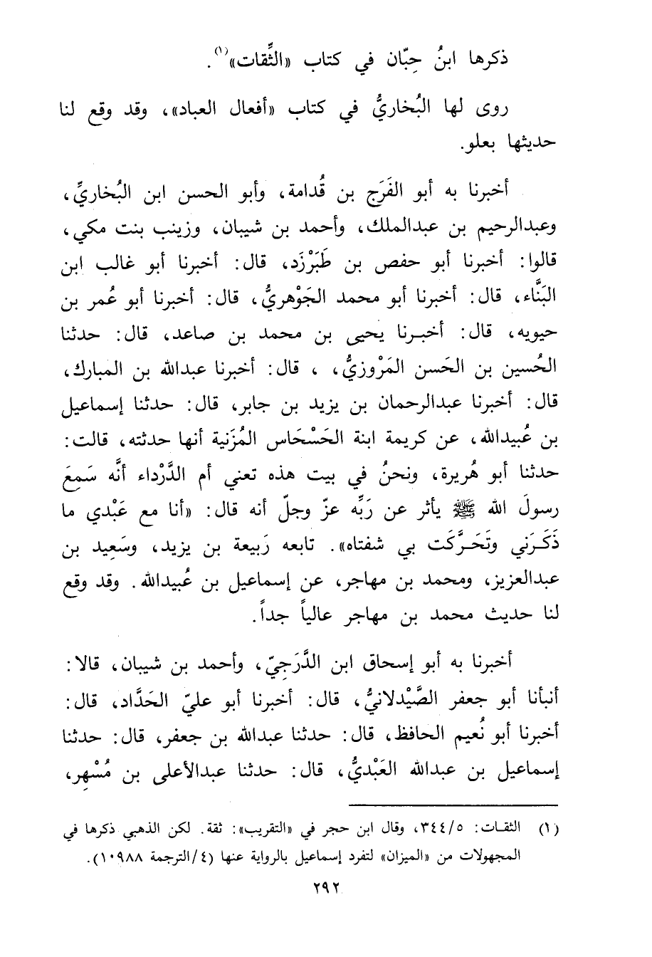 أخبرنا بِهِ أَبُو الْفَرَجِ بْنُ قُدَامَةَ، وأَبُو الْحَسَنِ بْنُ الْبُخَارِيِّ، وعَبد الرَّحِيمِ بْن عَبد المَلِك، وأَحْمَد بْن شَيْبَانَ، وزَيْنَبُ بِنْتُ مَكِّيٍّ، قَالُوا: أخبرنا أبو حفص بن طَبَرْزَذَ، قال: أخبرنا أَبُو غالب ابْن البناء، قال: أَخْبَرَنَا أبو مُحَمَّد الْجَوْهَرِيُّ، قال: أخبرنا أَبُو عُمَر بْنُ حَيَّوَيْهِ، قال: أخبرنا يَحْيَى بْن مُحَمَّد بْن صاعد، قال: حَدَّثَنَا الْحُسَيْنُ بْنُ الْحَسَنِ الْمَرْوَزِيُّ، قال: أَخْبَرَنَا عَبد الله بْن الْمُبَارَكِ، قال: أخبرنا عَبْدُ الرَّحْمَنِ بْن يزيد بْن جابر، قال: حَدَّثَنَا إِسْمَاعِيلُ بْنُ عُبَيد اللَّهِ، عَنْ كَرِيمَةَ ابْنَةِ الْحَسْحَاسِ الْمُزَنِيَّةِ أَنَّهَا حَدَّثَتْهُ، قَالَتْ: حَدَّثَنَا أَبُو هُرَيْرة، ونَحْنُ فِي بَيْتِ هَذِهِ تَعْنِي أُمَّ الدَّرْدَاءِ أَنَّهُ سَمِعَ رَسُول اللَّهِ صلى الله عليه وسلم يأثر عن ربه عزو جل أَنَّهُ قال: أَنَا مَعَ عَبْدِي مَا ذَكَرَنِي وتَحَرَّكَتْ بِي شَفَتَاهُ". تَابَعَهُ رَبِيعَةُ بْنُ يَزِيدَ، وسَعِيد بْن عَبْد الْعَزِيزِ، ومحمد بْن مُهَاجِرٍ، عَنْ إِسْمَاعِيلَ بْنِ عُبَيد اللَّهِ. وقَدْ وقَعَ لَنَا حَدِيثُ مُحَمَّدِ بْنِ مُهَاجِرٍ عَالِيًا جِدًّا.