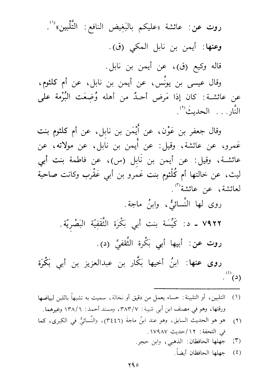 (1) التلبين، أو التلبينة: حساء يعمل من دقيق أو نخالة، سميت به تشبها باللبن لبياضها ورقتها، وهو في مصنف ابن أَبي شَيْبَة: 7 / 383، ومسند أحمد: 6 / 138 وغيرهما.