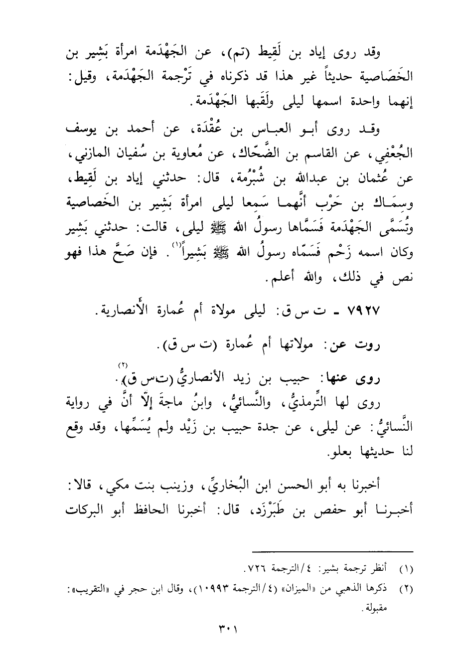 (2) ذكرها الذهبي من" الميزان" (4 / الترجمة 10993) ، وَقَال ابن حجر في "التقريب": مقبولة.